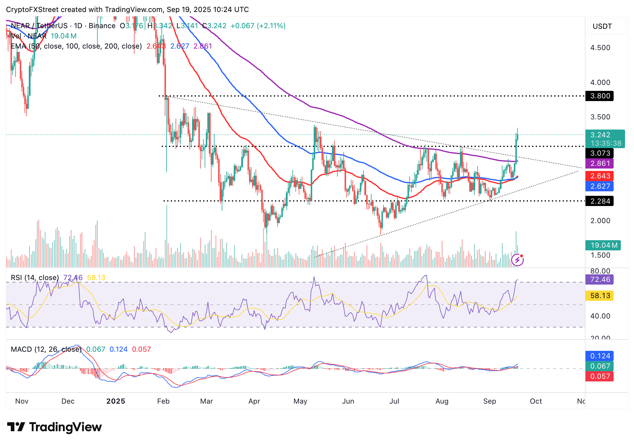 Los alcistas de Near Protocol siguen en gran medida en control al momento de escribir el viernes, aunque el precio se ha retirado de su máximo intradía de 3.34$. La ruptura se construyó sobre señales macroeconómicas sólidas tras la reducción de 25 puntos básicos en la tasa de interés de la Reserva Federal de los Estados Unidos (Fed) a un rango de 4.00% a 4.25%. Además, el interés en torno a la economía de IA en el sector de criptomonedas ha ayudado.