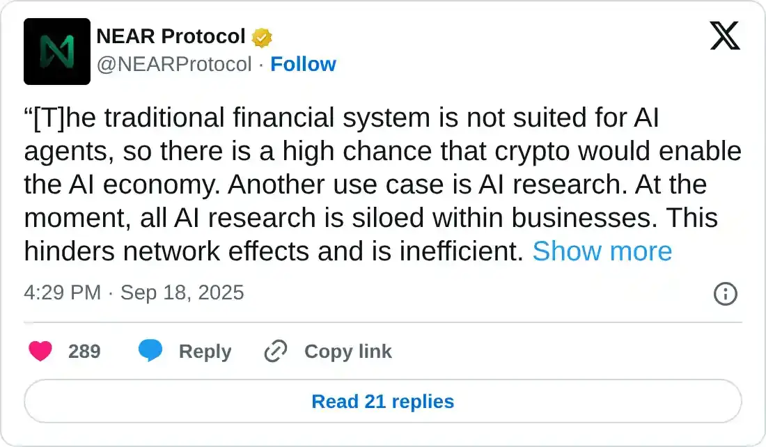Según Alex Shevchenko, el exgerente de producto de Near Protocol y actual CEO de Aurora Labs, "el sistema financiero tradicional no es adecuado para los agentes de IA, por lo que hay una alta probabilidad de que las criptomonedas habiliten la economía de IA. Otro caso de uso es la investigación de IA."