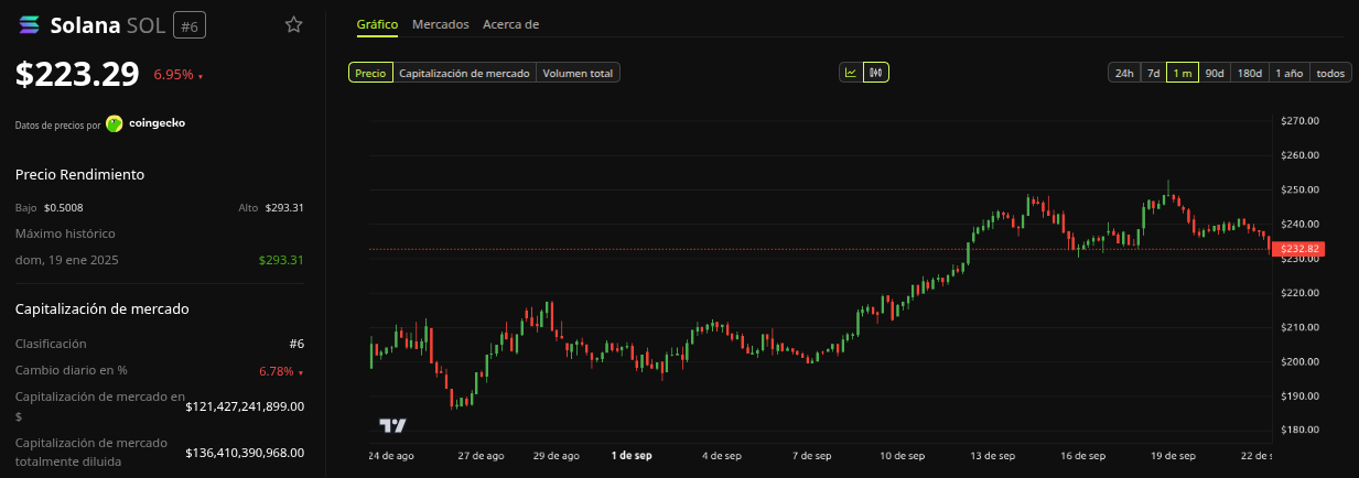 Los soportes están en 210-220 dólares, con resistencias en 270-280 dólares, niveles clave para Q4 2025.El volumen de trading acompaña las alzas, pero es menor que en picos previos, reflejando cautela. El ADX señala una tendencia alcista moderada, respaldada por fundamentos como el crecimiento en DeFi y NFT.