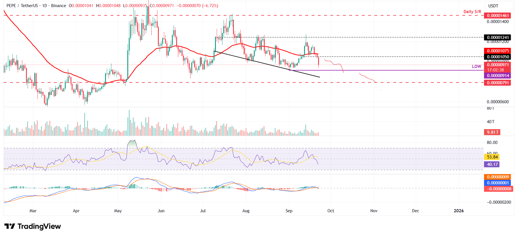 Al igual que DOGE y SHIB, los indicadores RSI y MACD de PEPE señalan un debilitamiento del impulso, apoyando la visión bajista.