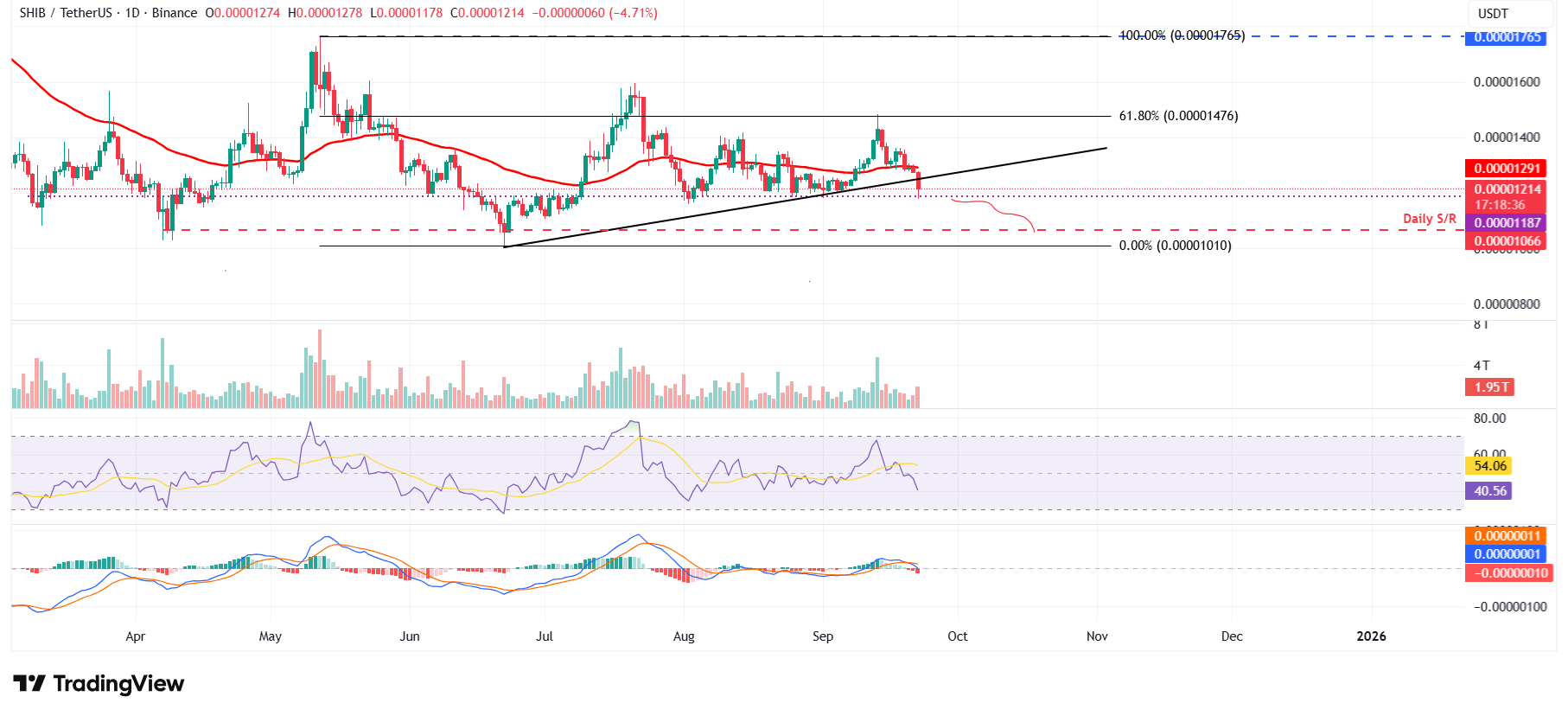 El precio de Shiba Inu encontró rechazo alrededor de su nivel de retroceso de Fibonacci del 61.8% en 0.0000147$ (dibujado desde el máximo del 12 de mayo de 0.0000176$ hasta el mínimo del 22 de junio de 0.0000100$) el 13 de septiembre y cayó casi un 8% hasta el domingo. En el momento de escribir el lunes, continúa negociándose a la baja alrededor de 0.0000121$, rompiendo por debajo de la línea de tendencia ascendente (dibujada conectando múltiples mínimos desde el 22 de junio).