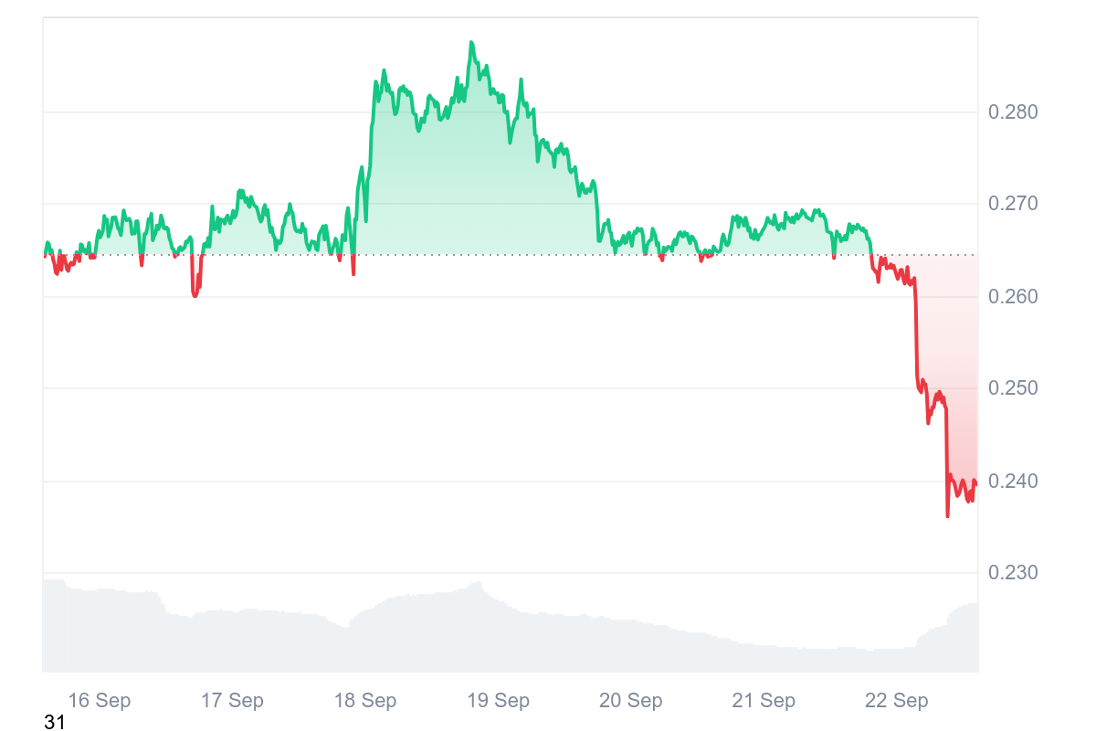 - El precio de Dogecoin cayó un 11% a 0,23 dólares, con un rango de negociación de 0,23 a 0,26 dólares.