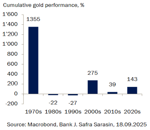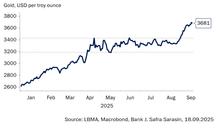 El precio del oro ha subido otros 300 dólares en las últimas dos semanas, hasta alcanzar casi los 3.700 dólares por onza troy, impulsado por la perspectiva de una serie de recortes de tipos por parte de la Reserva Federal y la preocupación por la integridad de las instituciones estadounidenses. Últimamente, la industria de las criptodivisas también ha mostrado interés tanto por el oro como por las mineras. En nuestra opinión, la dinámica histórica del precio del oro sugiere que la actual recuperación toavía tiene recorrido. Además, las salidas de criptomonedas podrían añadir un importante potencial alcista, dado el considerable tamaño del mercado.