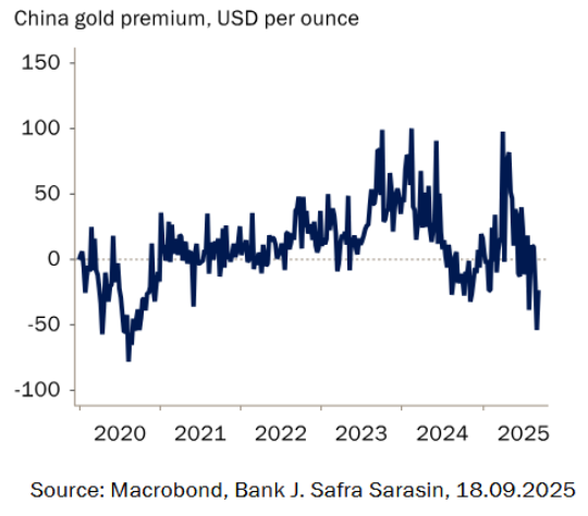 A finales de agosto y principios de septiembre se registraron las mayores entradas en los ETFs respaldados por oro físico desde abril, tras un verano bastante tranquilo. Los ETFs norteamericanos registraron entradas netas agregadas de 50 toneladas en las últimas dos semanas. Con 23 toneladas, los ETFs europeos también experimentaron grandes entradas netas, mientras que las tenencias de los ETFs asiáticos se mantuvieron relativamente estables. Esto coincidió con la caída de la prima del oro en China a territorio negativo, lo que subraya que la demanda física está impulsada predominantemente por los compradores occidentales en los últimos tiempos (Gráfico 4).