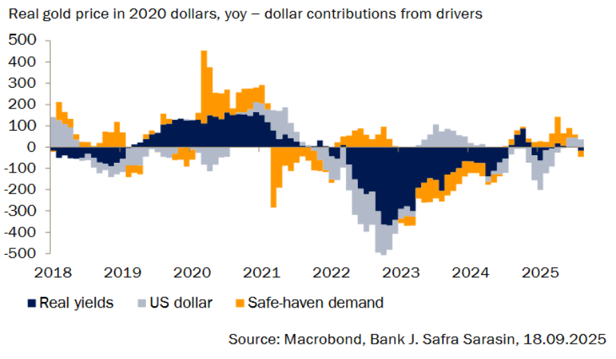 Desde principios de septiembre, el precio del oro ha subido otros 300 dólares, hasta alcanzar casi los 3.700 dólares por onza troy (Gráfico 1). En nuestra opinión, hay una serie de factores que han contribuido a la dinámica reciente. En primer lugar, la trayectoria prevista de recortes de tipos por parte de la Fed se ha acentuado considerablemente, dada la reciente debilidad de los datos del mercado laboral estadounidense. Los tipos de interés han tenido menos importancia recientemente para la dinámica de los precios del oro que en el pasado, pero continúan ejerciendo una influencia direccional sobre el metal precioso, junto con la debilidad del dólar (Gráfico 2). En segundo lugar, el cambio tectónico de la Administración Trump en las políticas estadounidenses sigue suscitando inquietudes sobre la integridad de las instituciones estadounidenses, lo que supone un importante impulso para el oro. En particular, los ataques del presidente Trump a la Fed se han intensificado en las últimas semanas, culminando en el intento de destituir a la miembro de la Junta de la Reserva Federal Lisa Cook, que finalmente esperamos que resuelva el Tribunal Supremo.