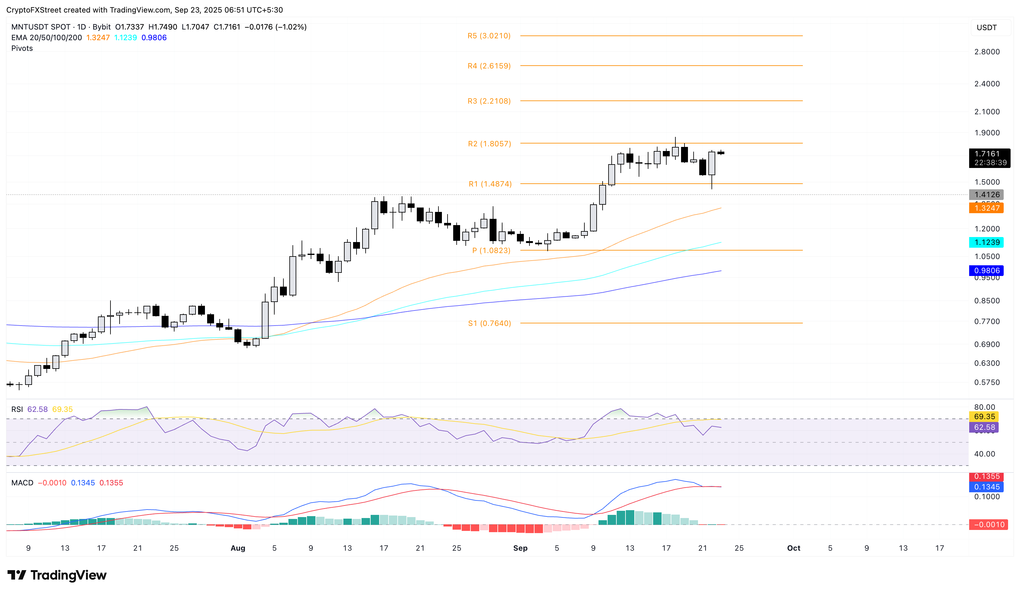 Mantle baja un 1% en el momento de la publicación el martes, tras el aumento del 11% del día anterior. La corrección intradía extiende la fase de consolidación entre los niveles de pivote R1 y R2 en 1.48$ y 1.80$, respectivamente.