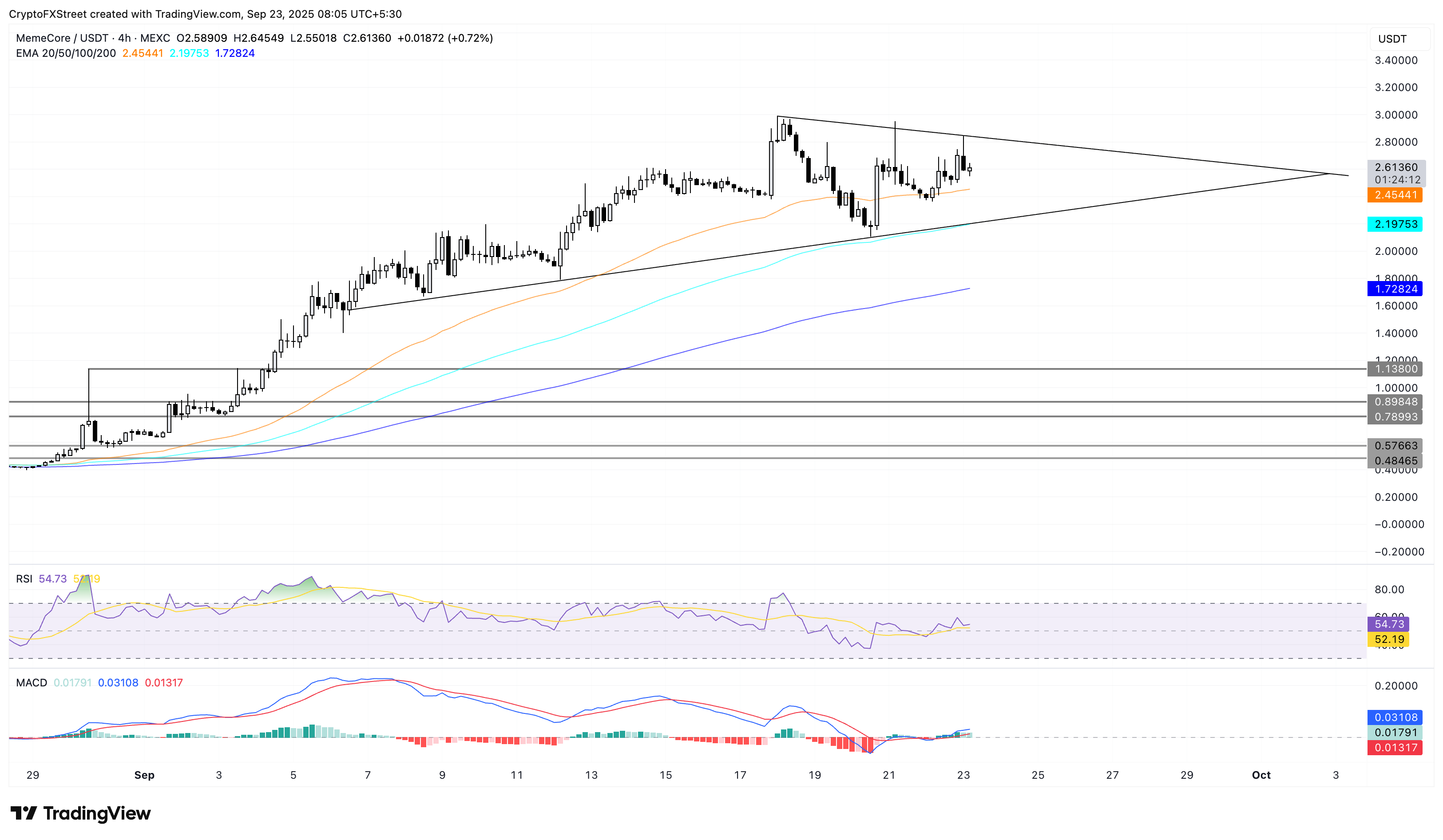 Si el impulso se mantiene, un rebote desde la EMA de 50 períodos podría impulsar a MemeCore hacia la línea de tendencia superior del patrón de triángulo cerca de 2.80$.