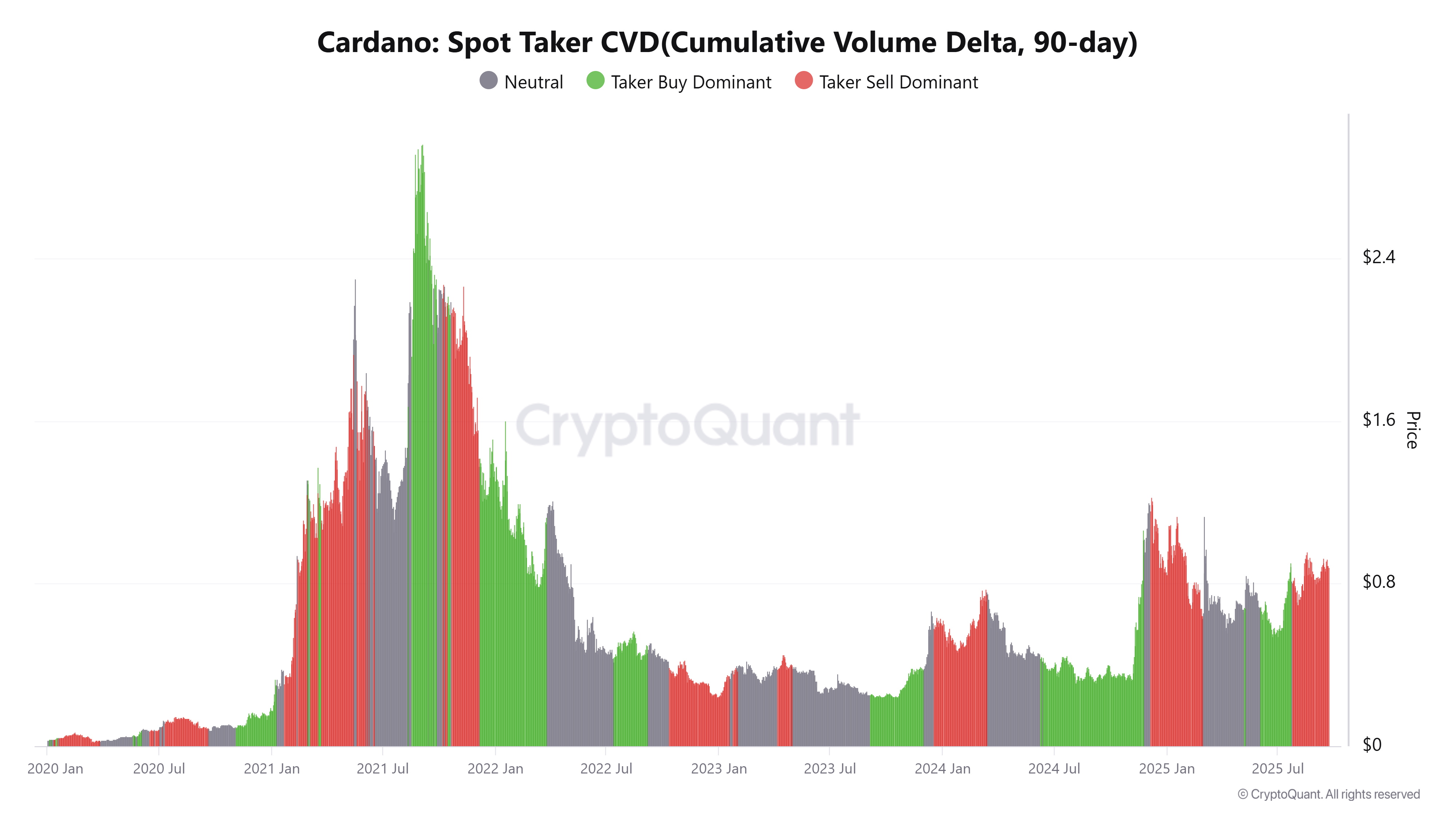 Aparte de la creciente actividad inactiva, los datos de CryptoQuant destacan la presión de venta sobre Cardano. El CVD de Taker (Delta de Volumen Acumulado) para Cardano se volvió negativo a mediados de agosto, y el valor ha estado disminuyendo constantemente desde entonces. Este indicador mide la diferencia acumulativa entre los volúmenes de compra y venta en el mercado durante un período de tres meses. Cuando el CVD de 90 días es positivo y está en aumento, sugiere la Fase Dominante de Compra de Taker, mientras que un valor negativo y en disminución indica la Fase Dominante de Venta de Taker.