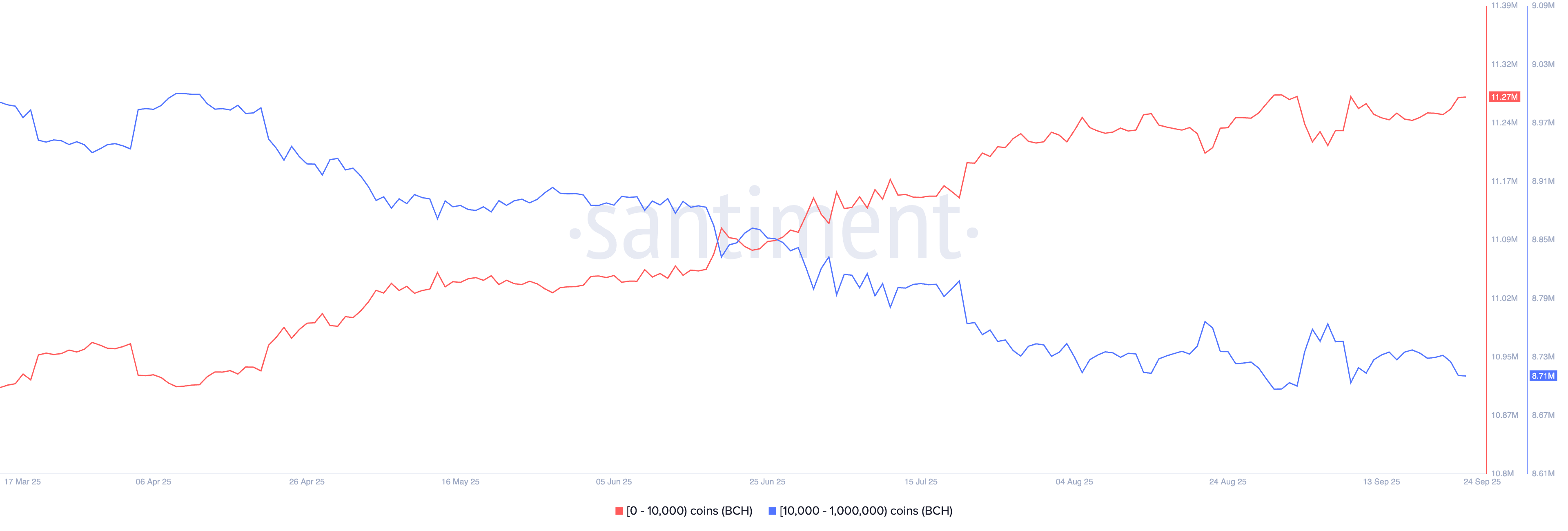 Los datos de Santiment muestran un deslizamiento en desarrollo entre los inversores minoristas y los grandes inversores en billeteras basado en la distribución de la oferta de Bitcoin Cash. Los inversores con menos de 10.000 BCH continúan la fase de acumulación, alcanzando un total de 11,27 millones de BCH.