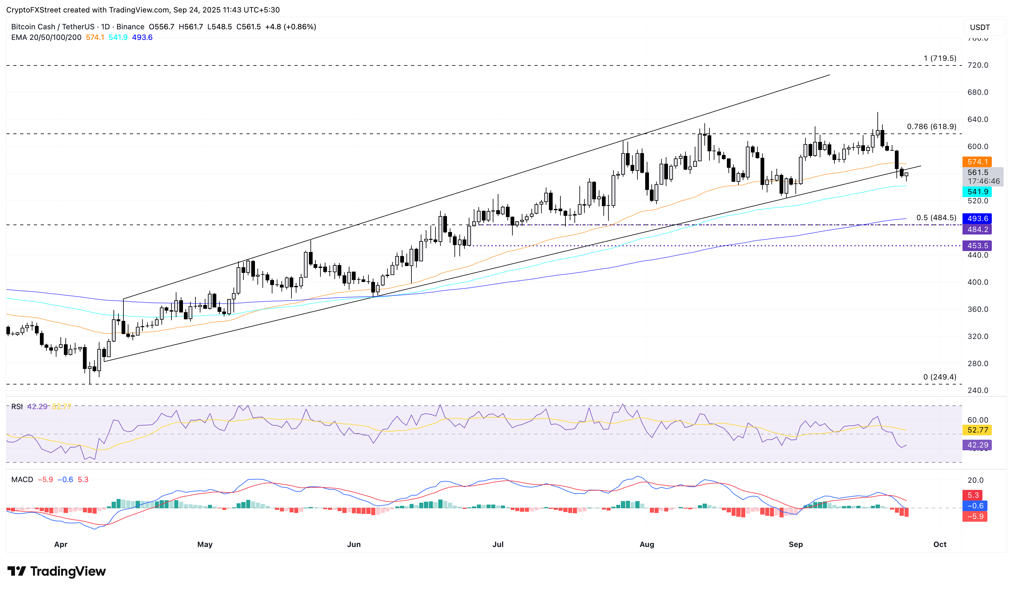 Bitcoin Cash se mantiene por encima de la media móvil exponencial (EMA) de 100 periodos en 541$, subiendo tras cinco días de tendencia a la baja y rompiendo un canal expansivo en el gráfico diario. A pesar del aumento a corto plazo, los indicadores de impulso en el mismo gráfico reflejan que el impulso bajista sigue siendo prominente.