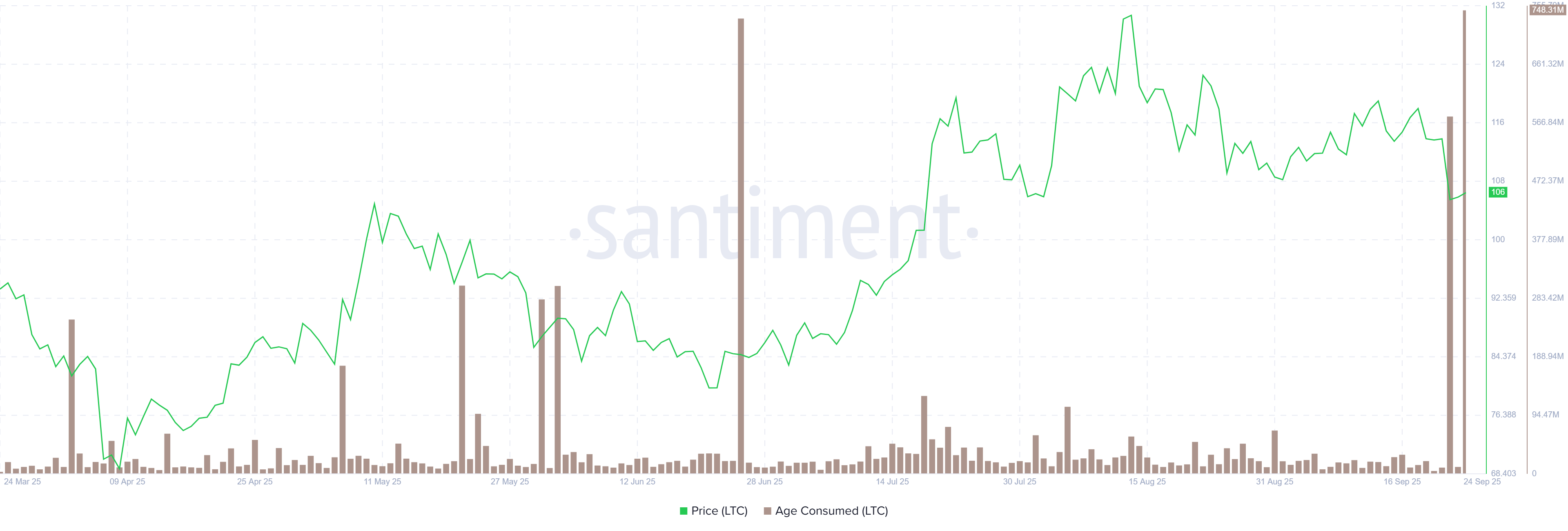 Gráfico del índice de Edad Consumida de LTC. Fuente: Santiment