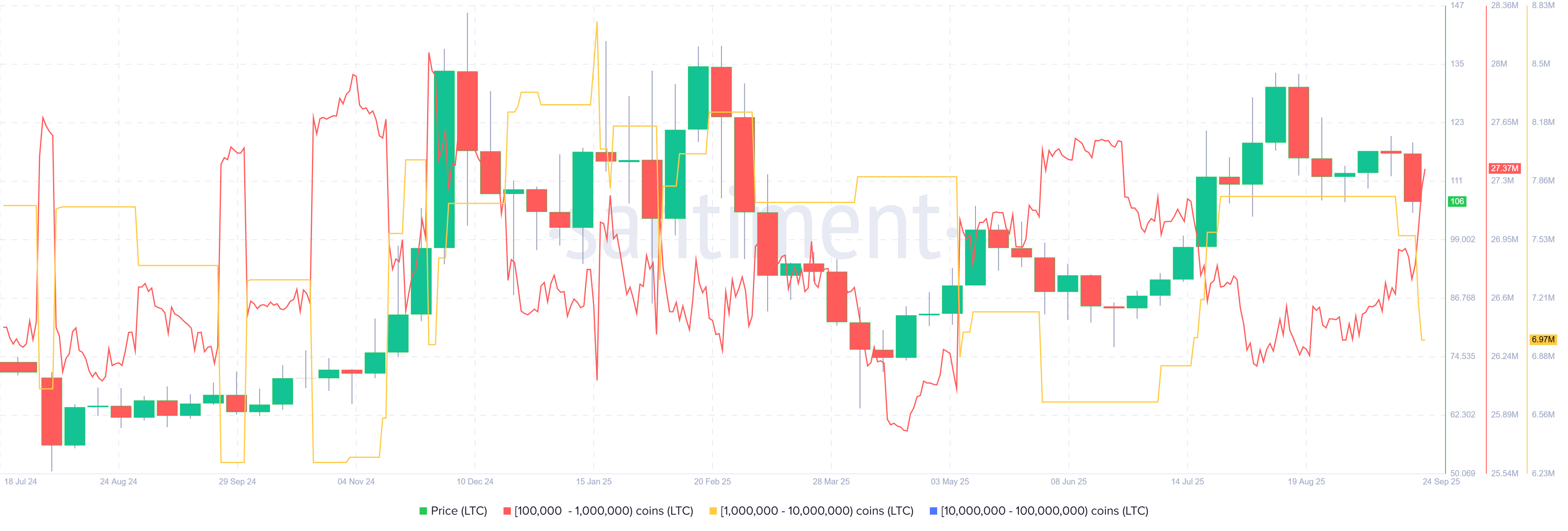 Los datos de Distribución de Suministro de Santiment respaldan una perspectiva alcista para Litecoin. La métrica indica que las ballenas que poseen entre 100,000 y 1 millón de tokens LTC (línea roja) han acumulado 660,000 tokens desde el 20 de septiembre. Durante el mismo período, las billeteras que poseen entre 1 millón y 10 millones de tokens LTC (línea amarilla) han reducido 580,000 tokens.