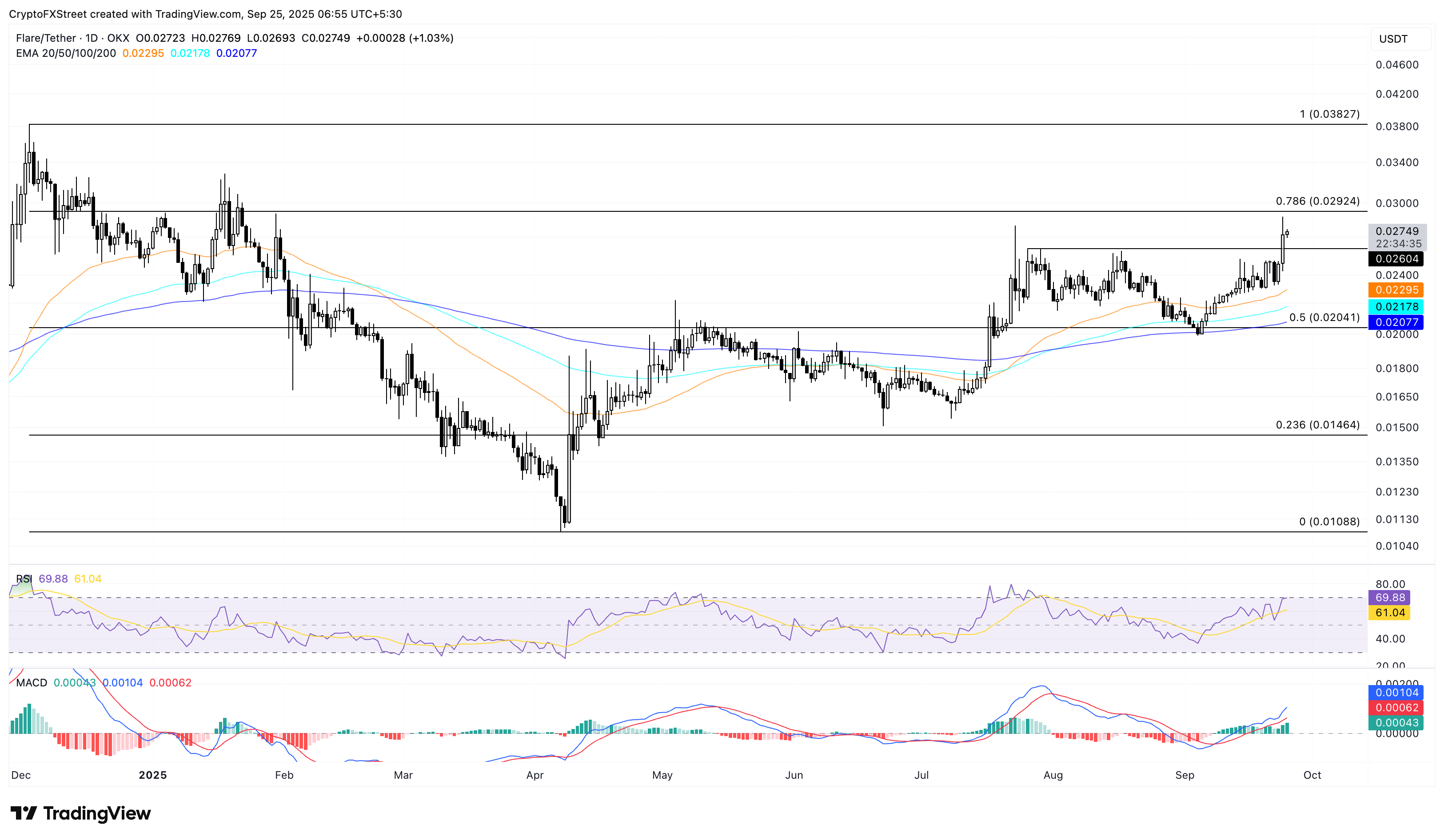 En la parte inferior, si FLR retrocede desde 0.02924 $, podría resultar en una nueva prueba de la EMA de 50 días en 0.2295 $.