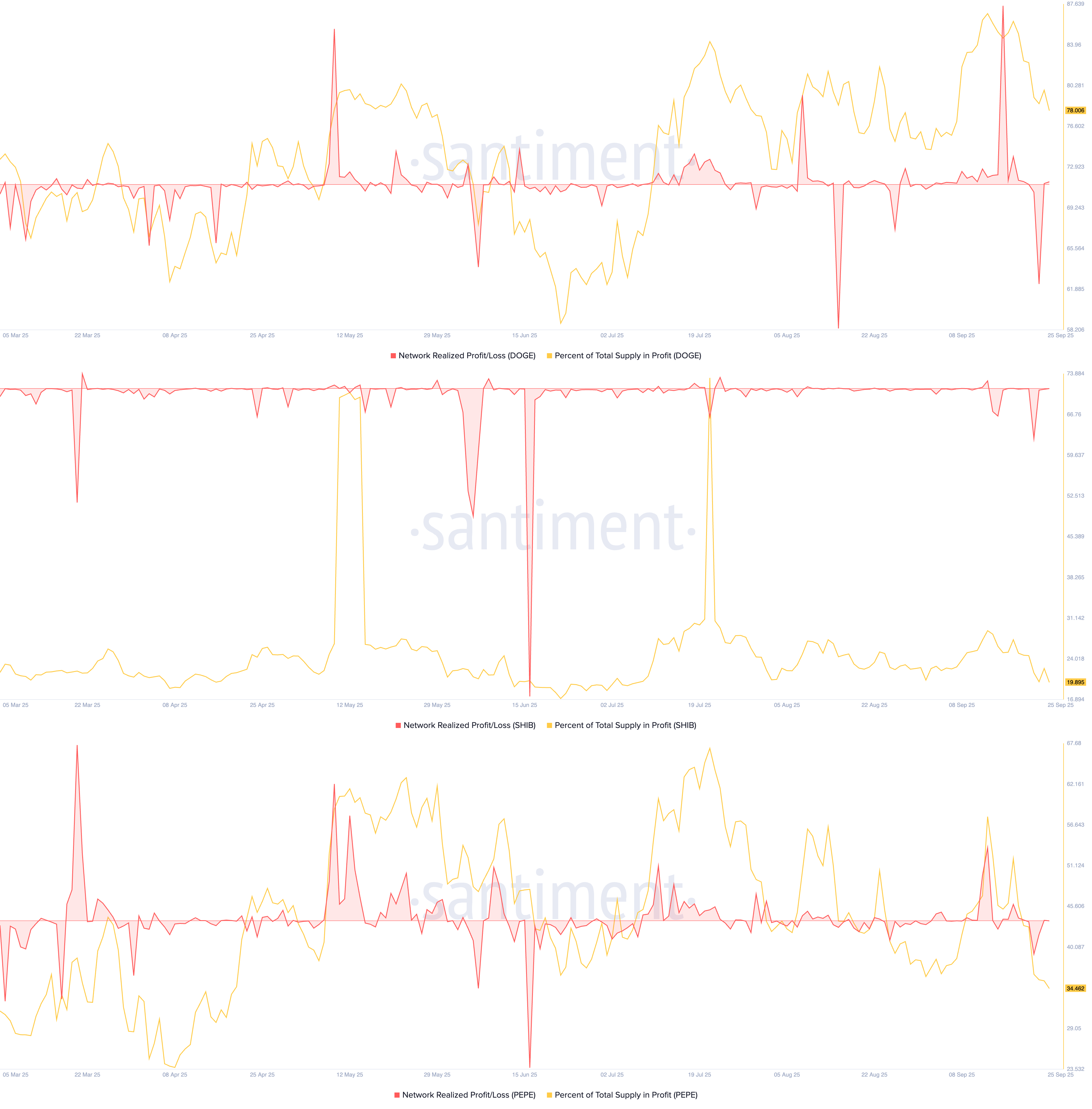 Los datos de Santiment muestran un pico a la baja en el Beneficio/Pérdida Realizada en la Red de Dogecoin, Shiba Inu y Pepe, indicando que los inversores descargaron 187,58 millones de DOGE, 34,31 millones de SHIB y 11,4 millones de PEPE con pérdidas en la última semana.