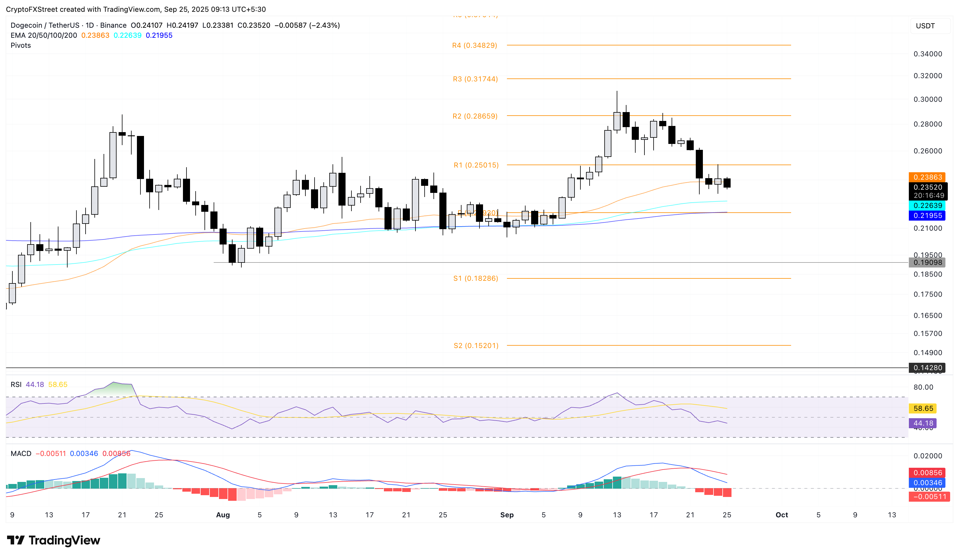 Dogecoin se desliza más de un 2% en el momento de la publicación el jueves, retrocediendo de la media móvil exponencial (EMA) de 50 días en 0,2386$. La tendencia a la baja apunta a la EMA de 200 días en 0,21955$.