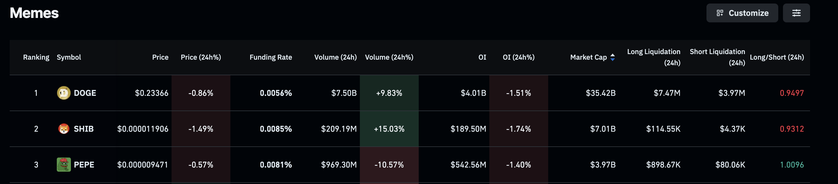 Datos de derivados de monedas meme. Fuente: CoinGlass