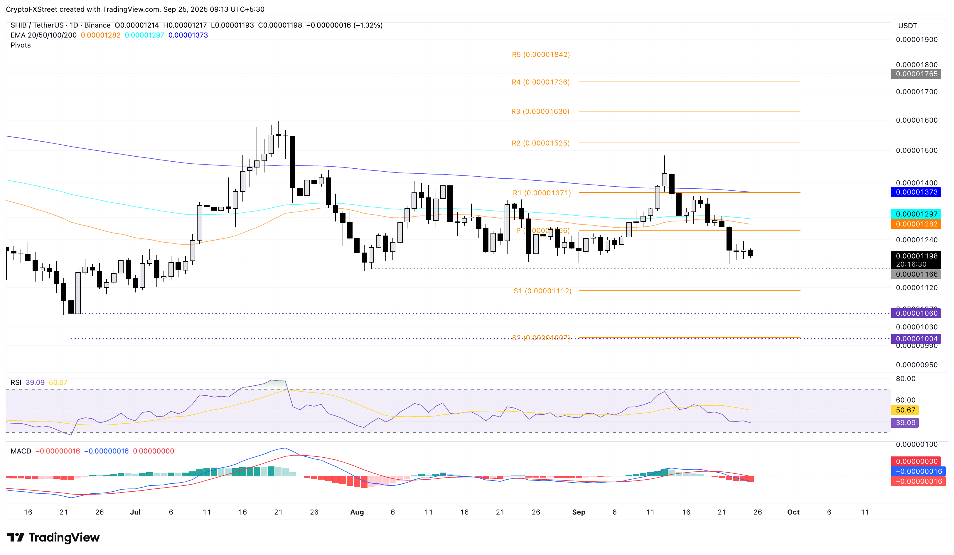 Shiba Inu se desliza un 1% en el momento de escribir el jueves, cotizando por debajo de 0,00001200$. El soporte inmediato para SHIB se encuentra en 0,00001166$, marcado por el mínimo del 3 de agosto.