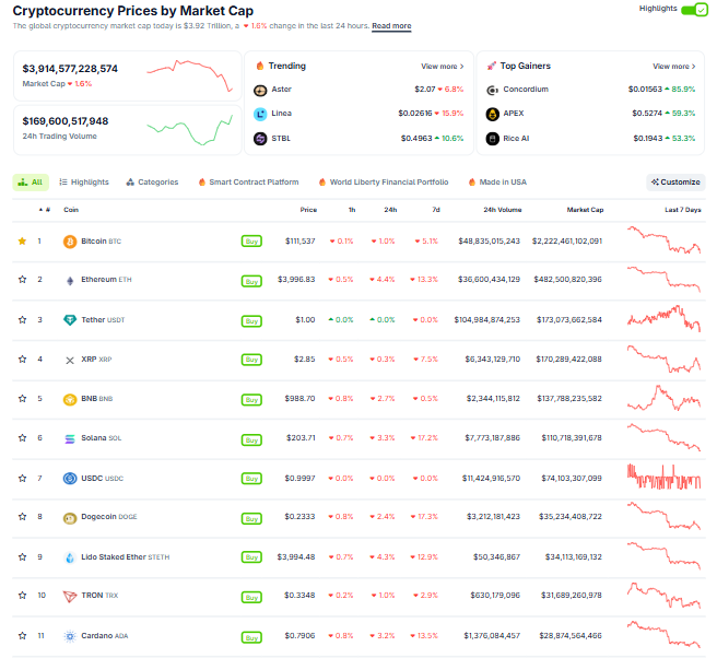 El mercado de criptomonedas en general cotiza en rojo el jueves, con monedas principales como Bitcoin cayendo por debajo de los 112.000$, y Ethereum deslizándose por debajo de los 4.000$. Mientras tanto, las principales altcoins como Ripple (XRP), BNB (BNB) y Solana (SOL) continúan extendiendo sus pérdidas.