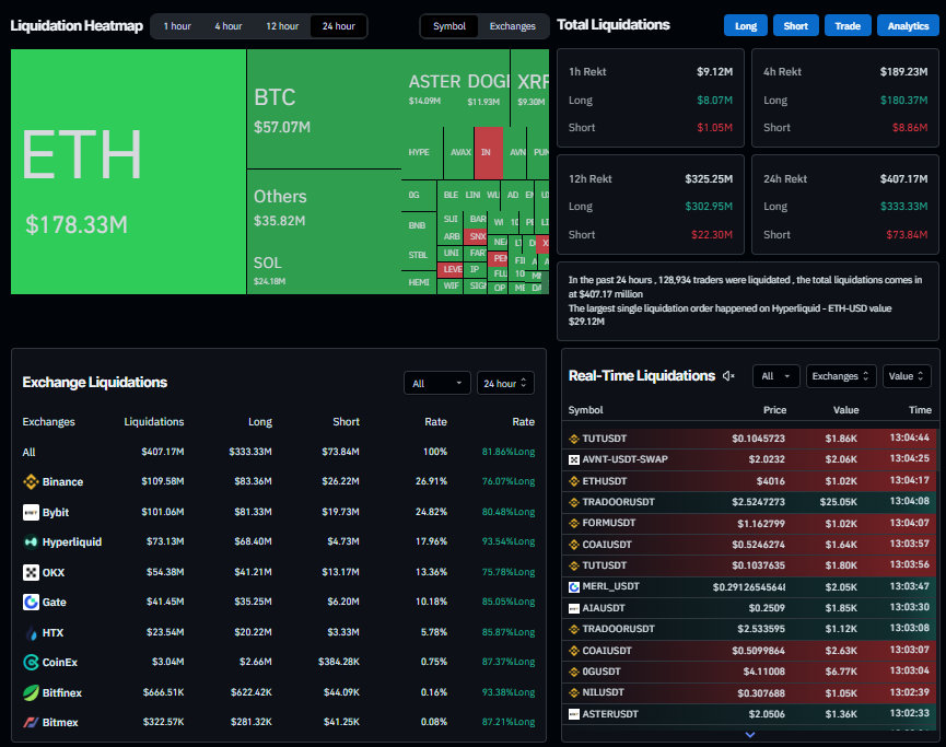 Según los datos de Coinglass, cerca de 129.000 operadores fueron liquidados en las últimas 24 horas, resultando en la liquidación de más de 400 millones de dólares en posiciones. El 81% de estas fueron apuestas largas, destacando la posición excesivamente alcista de los operadores, mientras que la mayor liquidación individual se produjo en Hyperliquid, donde se eliminó una posición ETH/USD por valor de 29,12 millones de dólares.