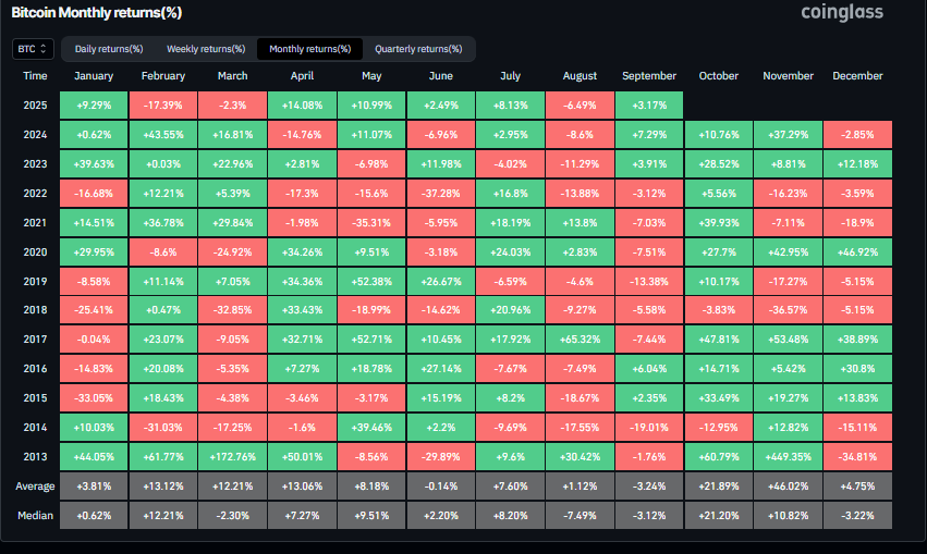 Los datos históricos de retorno mensual (%) de CoinGlass muestran que septiembre generalmente ha entregado retornos negativos para Bitcoin, promediando -3,24%. Mientras que el BTC ha subido un 3,17% hasta ahora este mes, los operadores deben permanecer cautelosos ya que la historia sugiere que el mes aún podría cerrar en rojo.