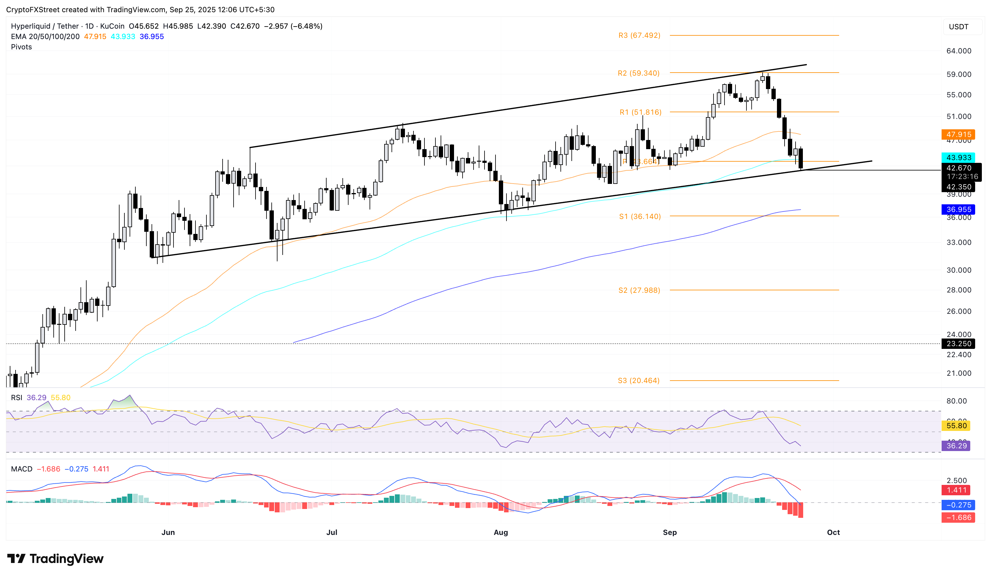 Hyperliquid cotiza por debajo de la media móvil exponencial (EMA) de 100 días en 43.93$, arriesgando una caída de un patrón de canal ascendente en el gráfico diario. Este patrón está formado por una línea de tendencia de resistencia que conecta los picos del 16 de junio y el 22 de julio, junto con una línea de tendencia de soporte que conecta el cierre del 29 de mayo y el 2 de agosto.