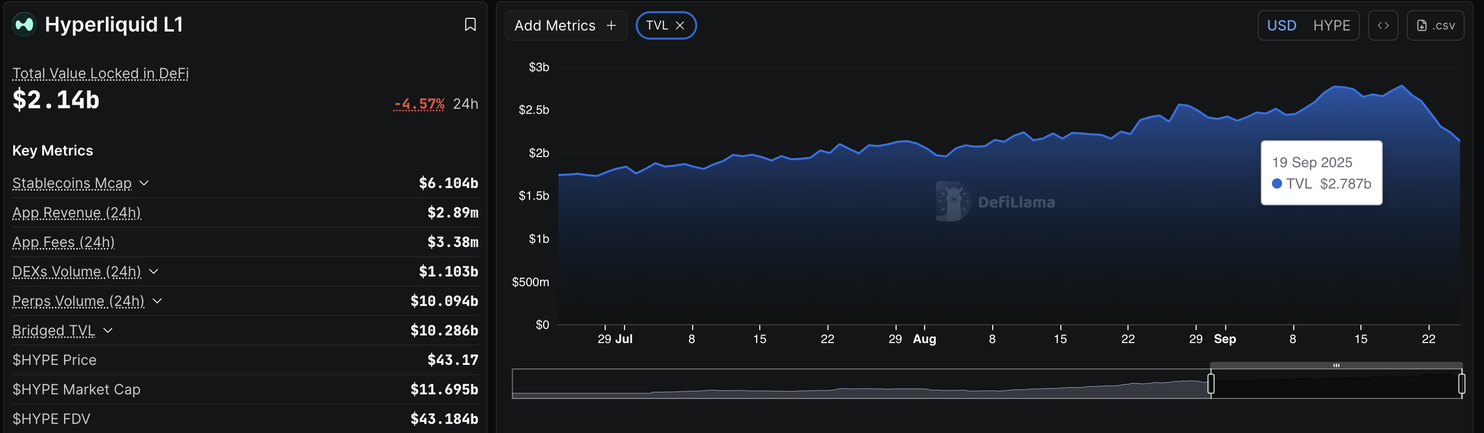 Los datos de DeFiLlama muestran que el Valor Total Bloqueado (TVL) en Hyperliquid ha disminuido a 2.14 mil millones de dólares el jueves, bajando desde el máximo histórico de 2.78 mil millones de dólares alcanzado el viernes. Esta significativa salida de activos asignados indica una fuerte disminución en el interés de los usuarios.