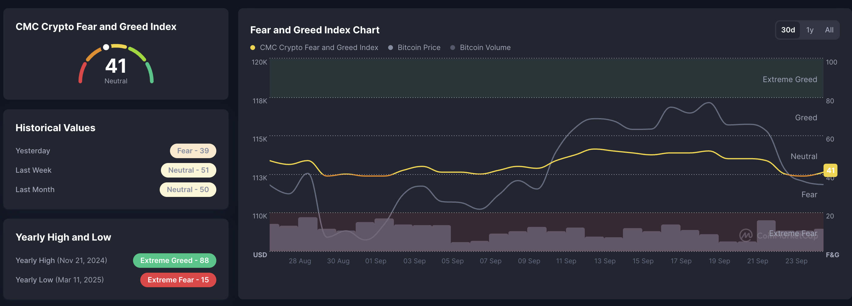 El Índice de Miedo y Codicia de CoinMarketCap se mantiene estable en la zona neutral en 41, tras una caída desde 51 la semana pasada. Si este índice cae por debajo de 40, señalará un sentimiento de aversión al riesgo en el mercado en general.