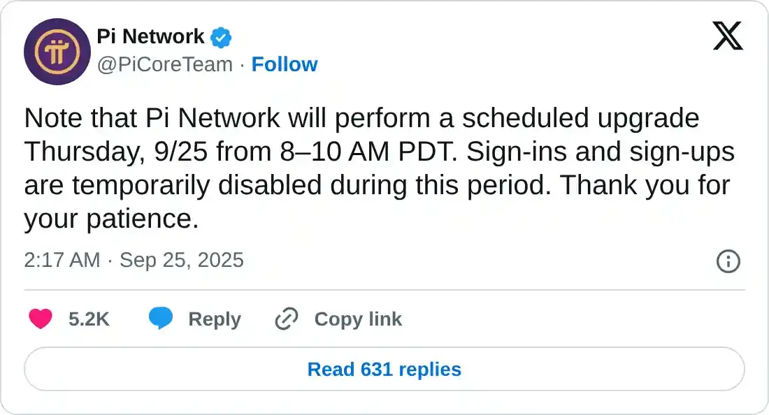 Pi Network anunció en una publicación de X el jueves que una actualización programada entre las 15:00 y las 17:00 GMT desactivará temporalmente las funciones. Esta actualización forma parte del cambio a la versión 23 del protocolo Stellar, que habilitará funcionalidades de contratos inteligentes en la Pi Network. A partir del jueves, la Testnet 1 de Pi Network ha completado su cambio, con la Testnet 2 en proceso de actualización. Después de esto, la Mainnet de Pi iniciará su actualización.