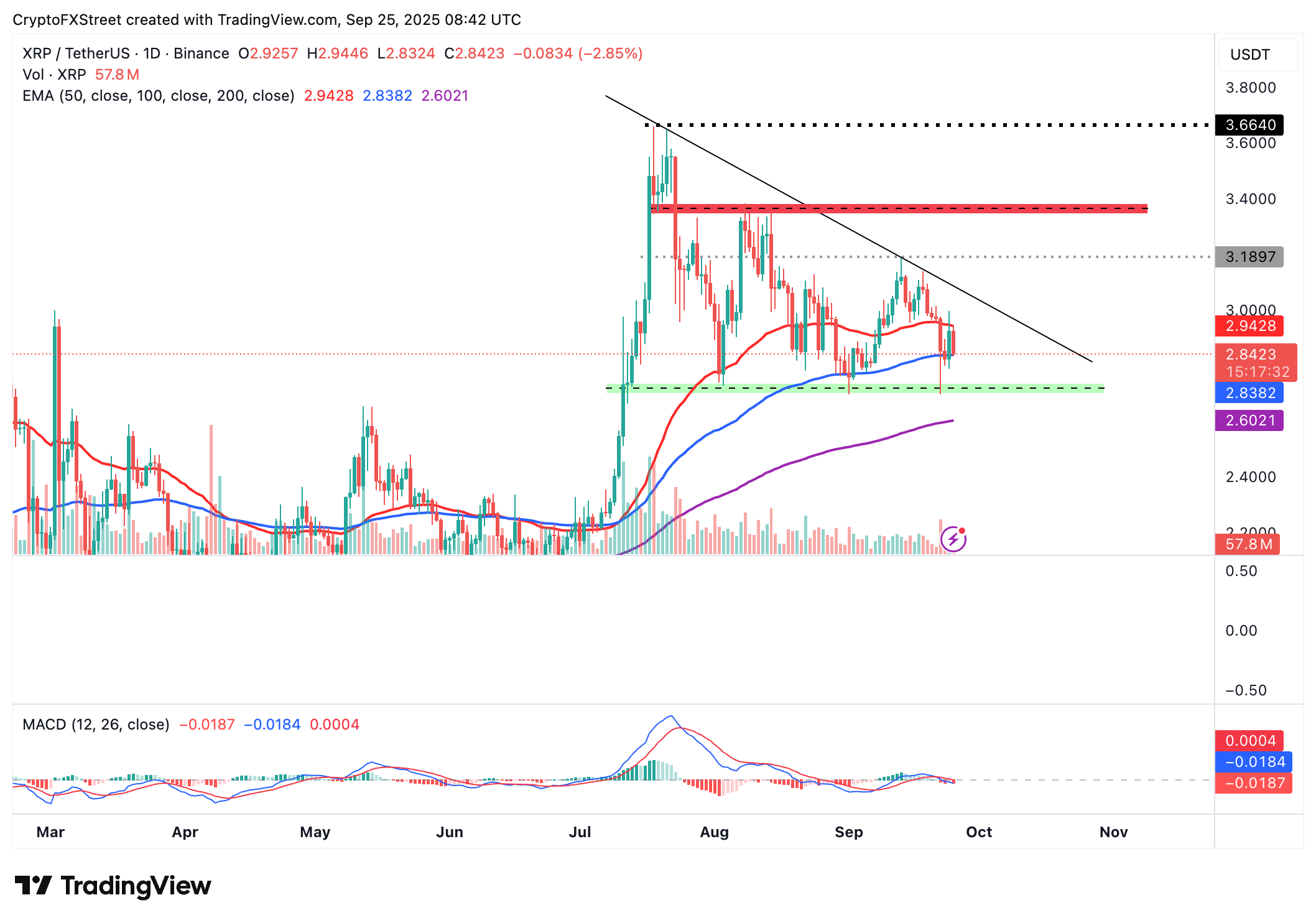 En cuanto a $XRP, los alcistas están sosteniendo delicadamente el soporte en 2.83$, proporcionado por la EMA de 100 días, después de enfrentar un rechazo en la EMA de 50 días posicionada en 2.83$. Los inversores anticiparían otro intento de ruptura desde el soporte a corto plazo, pero el RSI orientado a la baja en el gráfico diario podría desafiar la perspectiva alcista, dejando a $XRP vulnerable a más pérdidas.