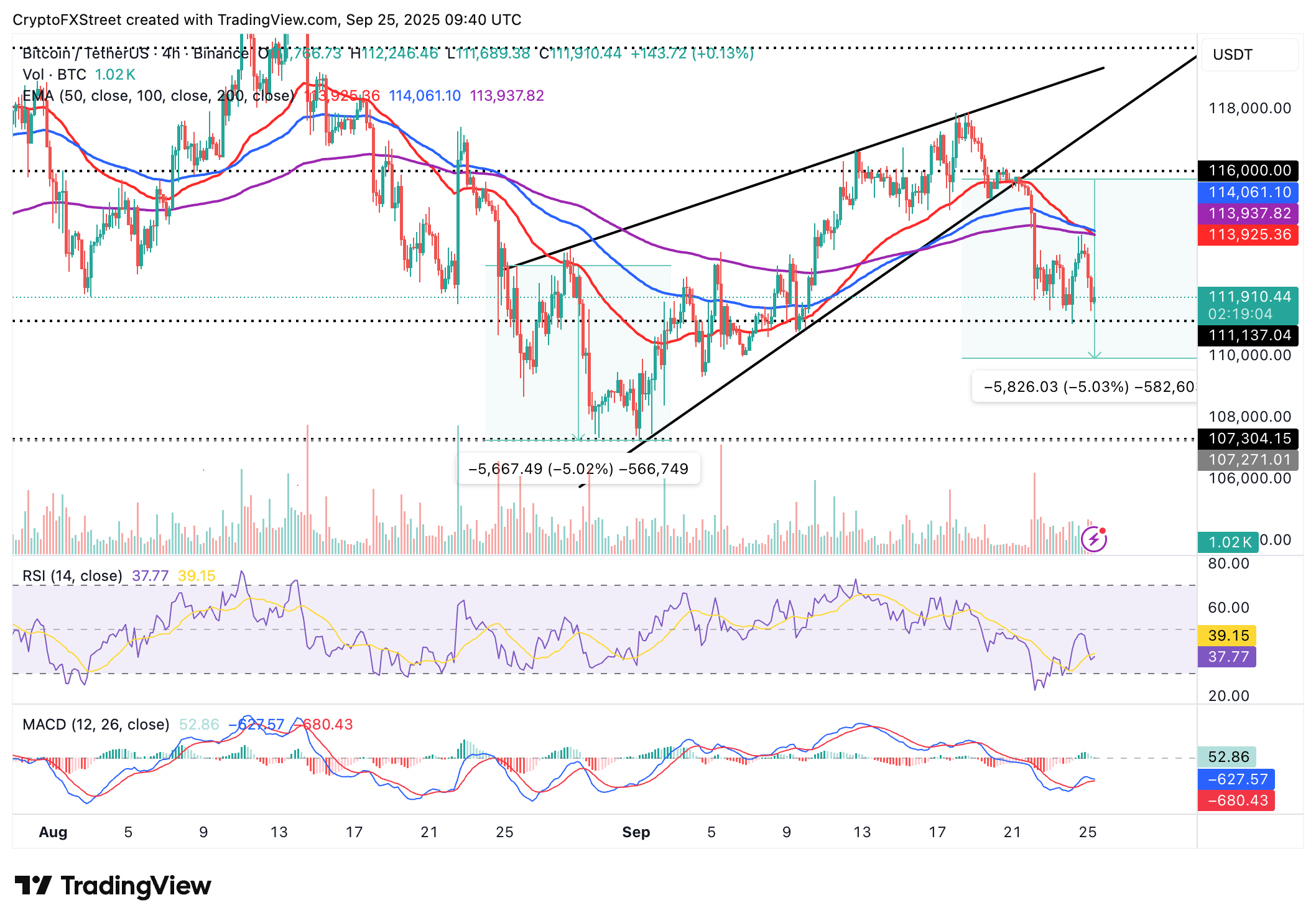 Un patrón de cuña ascendente en el mismo gráfico de 4 horas proyecta que el Bitcoin podría extender el declive por debajo del nivel de 110.000$ antes de recuperar el impulso alcista. Esto resultaría en una caída del 5% por debajo del patrón de cuña, como se muestra en el gráfico a continuación.