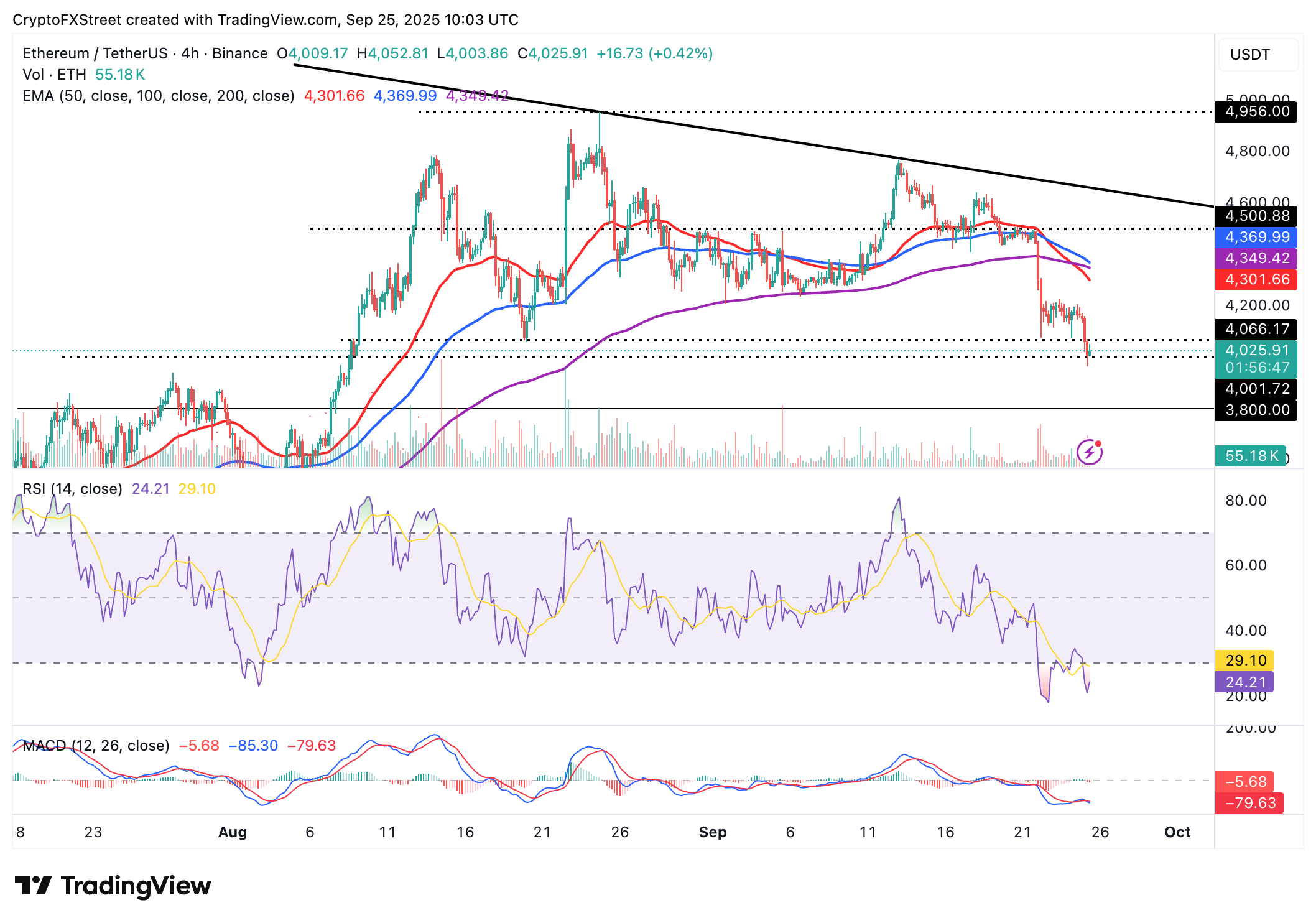 Ethereum probó el soporte a corto plazo de 4.000$ más temprano el jueves, extendiendo la corrección desde el comienzo de la semana. El token de contratos inteligentes también se mantiene por debajo de las medias móviles clave, incluyendo las EMAs de 50, 100 y 200 períodos en el gráfico de 4 horas, subrayando el sentimiento negativo en el mercado de criptomonedas en general.