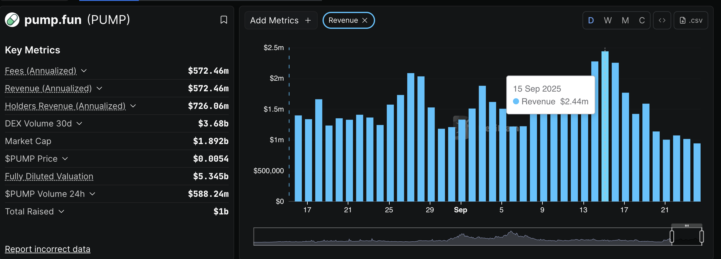 Según DefiLlama, los ingresos de Pump.fun aumentaron a 2,44 millones de dólares el 15 de septiembre, un día después de que el precio de PUMP alcanzara un nuevo máximo histórico de 0,0089$. Sin embargo, la tendencia ha sido a la baja desde entonces, con el recuento de ingresos promediando 945.000$ el jueves. La caída se produce en medio de una corrección más amplia en el mercado de criptomonedas, impulsada por un sentimiento de aversión al riesgo derivado de la incertidumbre macroeconómica en los Estados Unidos (EE.UU).