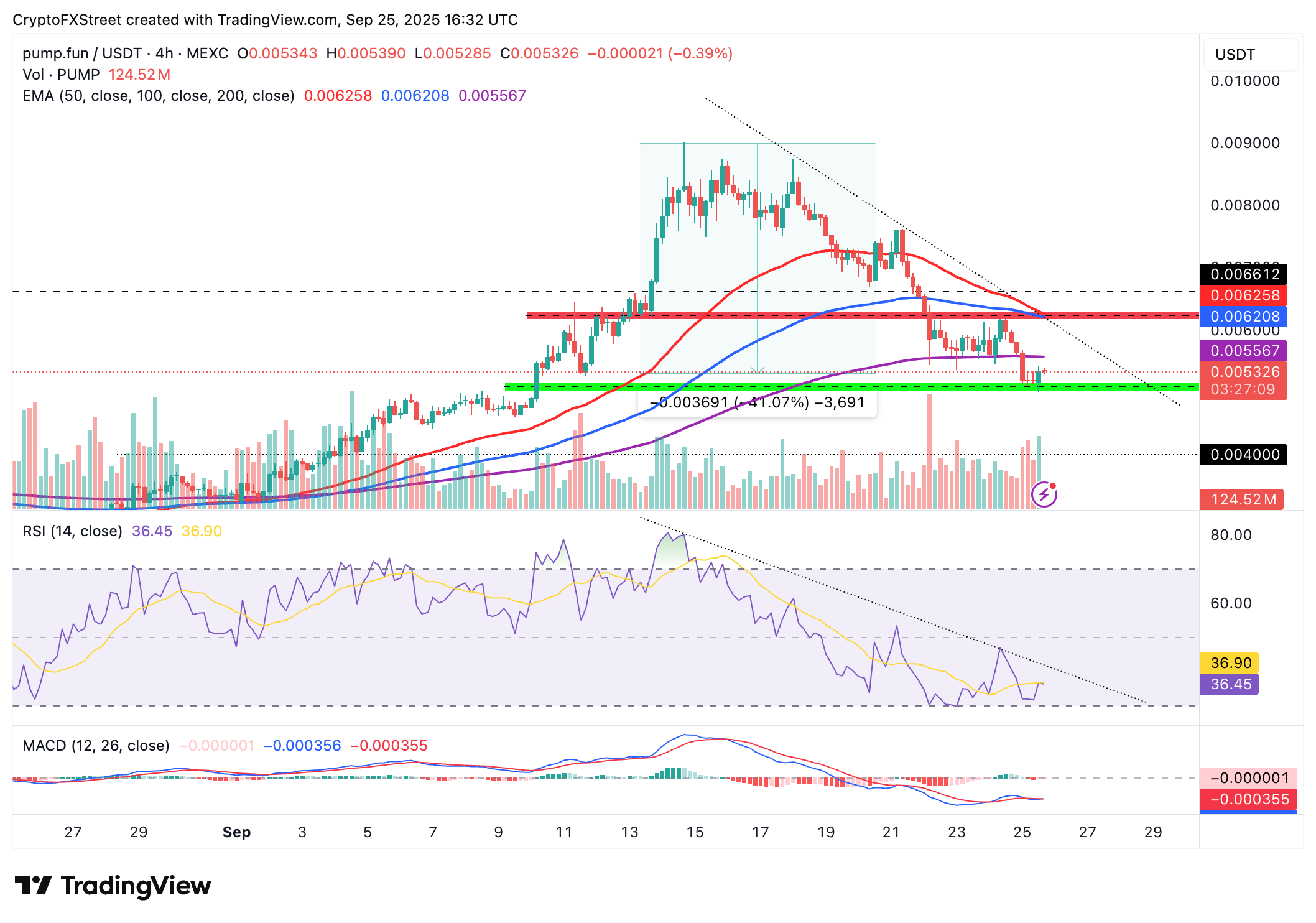 PUMP ofrece señales de recuperación a corto plazo en el gráfico de 4 horas, respaldadas por el Índice de Fuerza Relativa (RSI) que sube a 37 desde condiciones de sobreventa esta semana. Si el RSI rompe por encima de la línea de tendencia descendente punteada y se estabiliza hacia la línea media, indicará que se está construyendo un impulso alcista y apoyará una recuperación en el precio de PUMP.