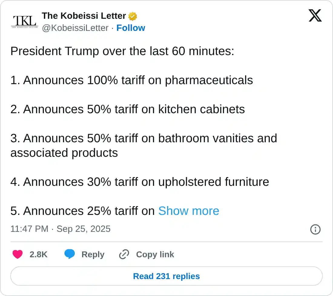 Además, el presidente de EE.UU., Donald Trump, está imponiendo aranceles a productos farmacéuticos, gabinetes de cocina, camiones pesados y otros productos, que entrarán en vigor el 1 de octubre, lo que añade riesgo de nuevas interrupciones comerciales.