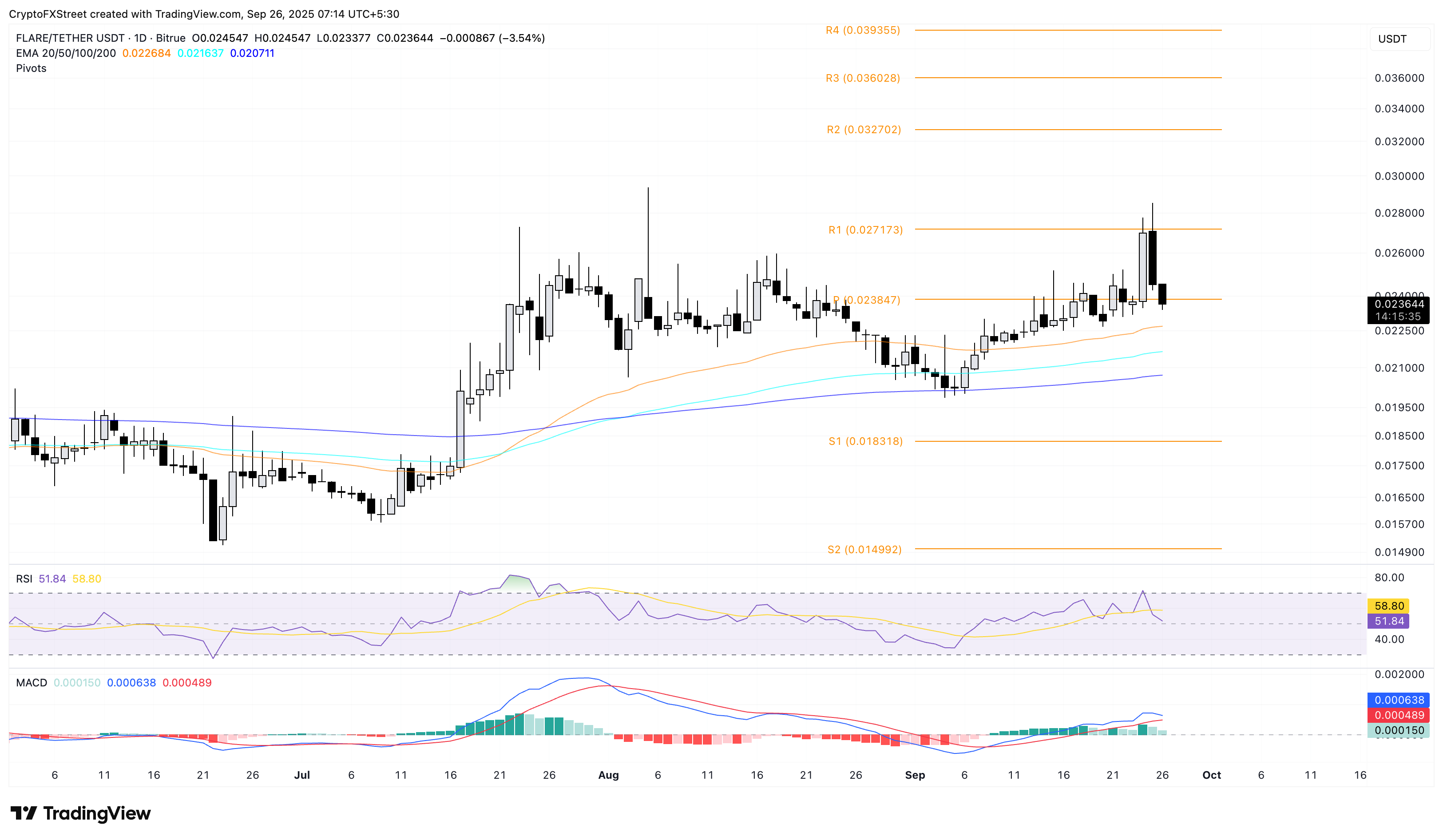 Por otro lado, si FLR recupera el nivel de pivote central en 0.023847$, podría volver a probar la resistencia R1 en 0.027173$.
