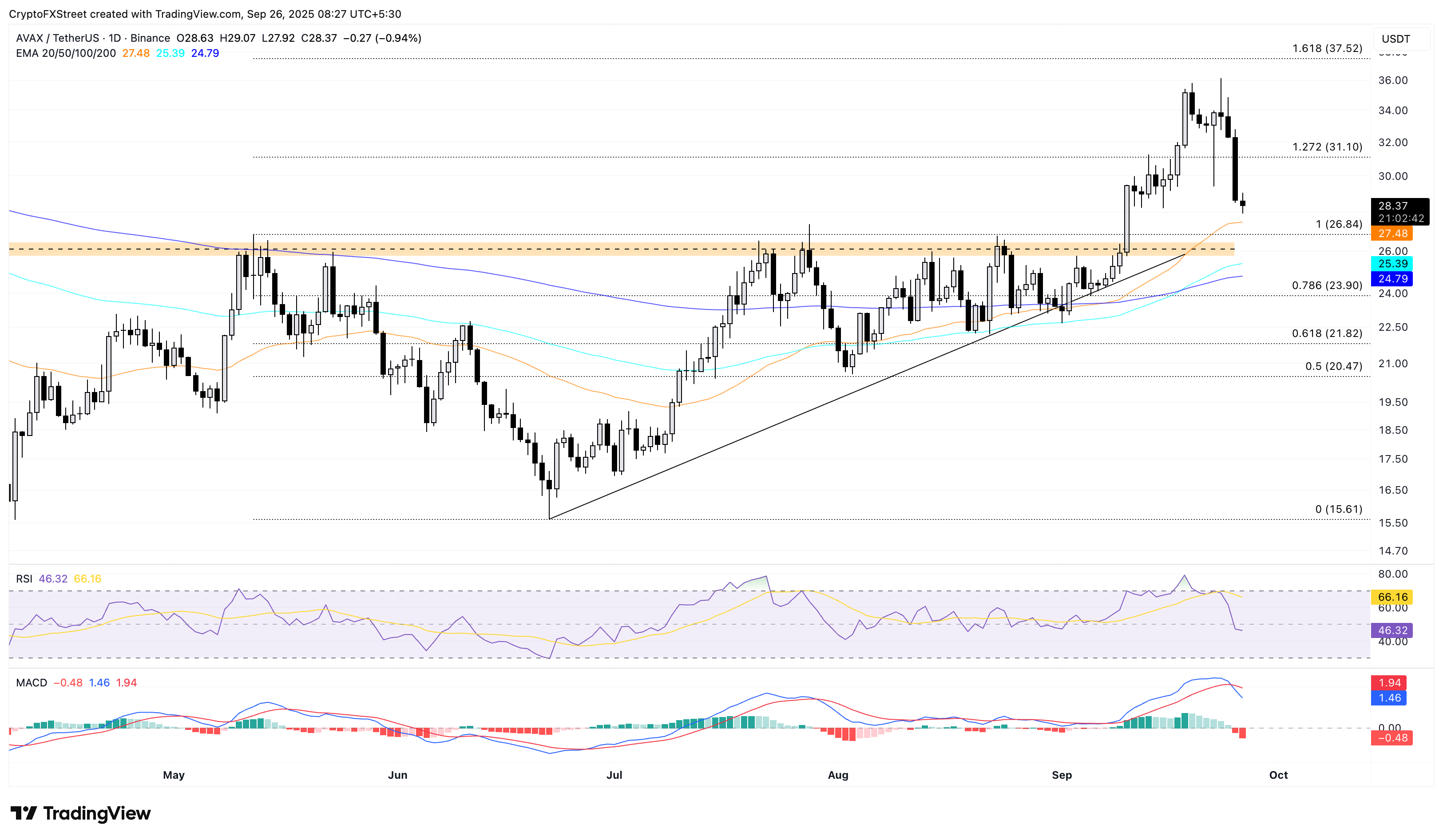 Si AVAX no logra mantenerse por encima de la EMA de 50 días, podría extender la caída hasta el nivel de 26.84$, seguido de la EMA de 100 días en 25.39$.