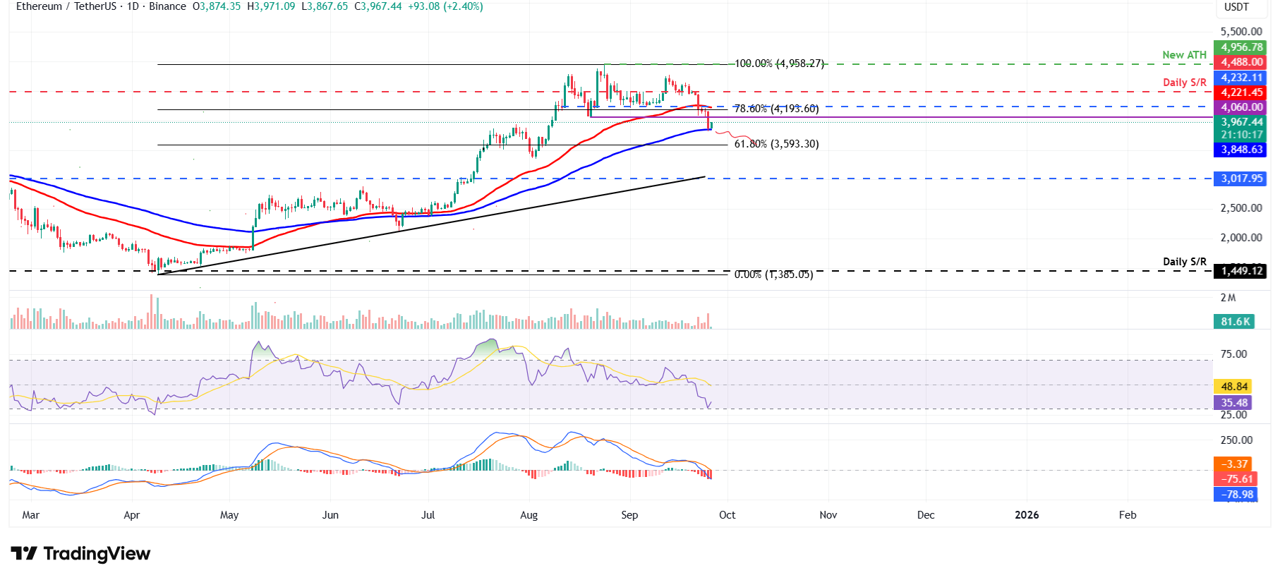 Si $ETH cierra por debajo de la EMA de 100 días en 3.848$ de manera diaria, podría extender la caída hacia el siguiente soporte en 3.593$.