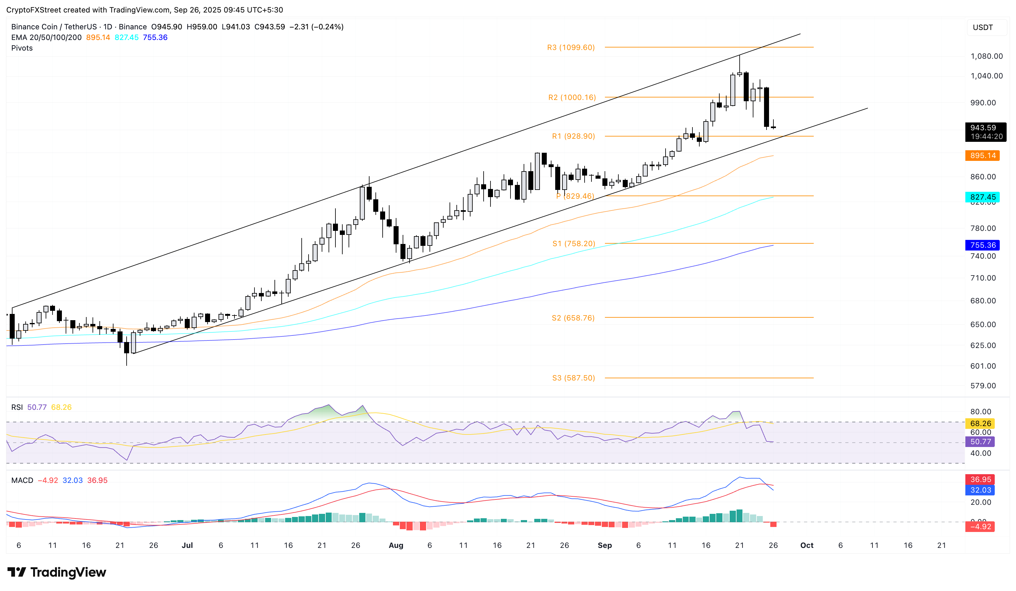 BNB se acerca a la línea de límite inferior de un patrón de canal ascendente en el gráfico diario. El token de intercambio centralizado (CEX) revirtió desde la línea de tendencia superior en su máximo histórico de 1.083$ el domingo, encendiendo el ciclo de descenso actual dentro del canal paralelo.