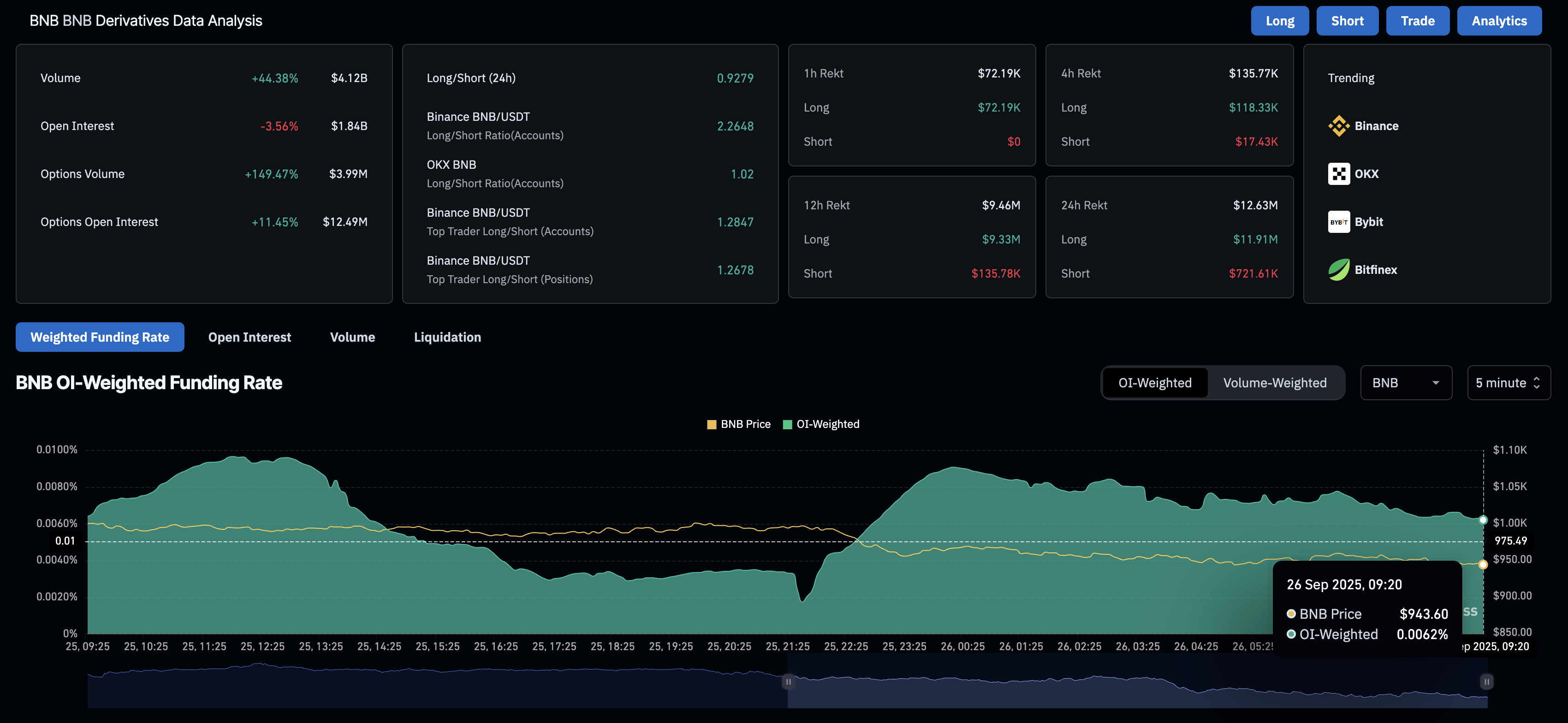 Los datos de CoinGlass indican que el interés abierto de BNB ha disminuido en un 3.56% en las últimas 24 horas, situándose ahora en 1.84 mil millones de dólares. Esta significativa salida de capital de los derivados de BNB indica un sentimiento de aversión al riesgo entre los operadores.