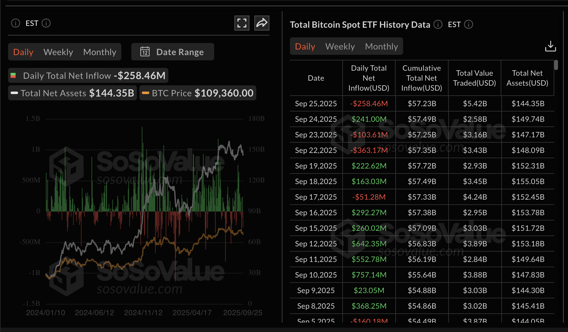 El Bitcoin continúa enfrentando una creciente presión a medida que los inversores reducen su exposición, citando un sentimiento débil en el mercado de criptomonedas en general. Esto se evidencia en los fondos cotizados (ETFs) de Bitcoin al contado en Estados Unidos (EE.UU.), que experimentaron salidas de 258 millones de dólares el jueves.