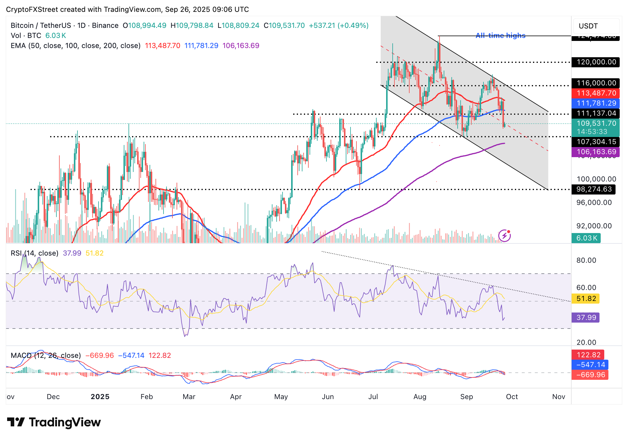 El Bitcoin se mantiene por encima de un rango de soporte entre 107.000 $ y 108.500 $, que fue probado el miércoles y a principios de septiembre. Los alcistas parecen decididos a impulsar una recuperación por encima de la resistencia de número redondo de 110.000 $. Sin embargo, el sentimiento débil en el mercado de criptomonedas en general y la disminución de la demanda podrían retrasar la ruptura.