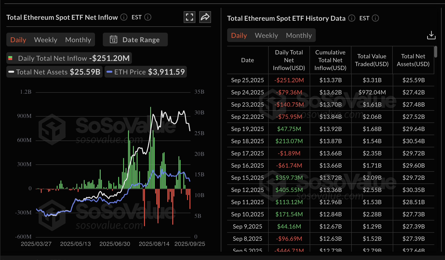 De manera similar, la demanda de productos ETF de Ethereum también ha disminuido significativamente esta semana, con salidas ahora en su cuarto día consecutivo. Según datos de SoSoValue, los ETFs de $ETH en EE.UU. vieron salidas de 251 millones de dólares el jueves, llevando la entrada neta acumulada a 13.370 millones de dólares.