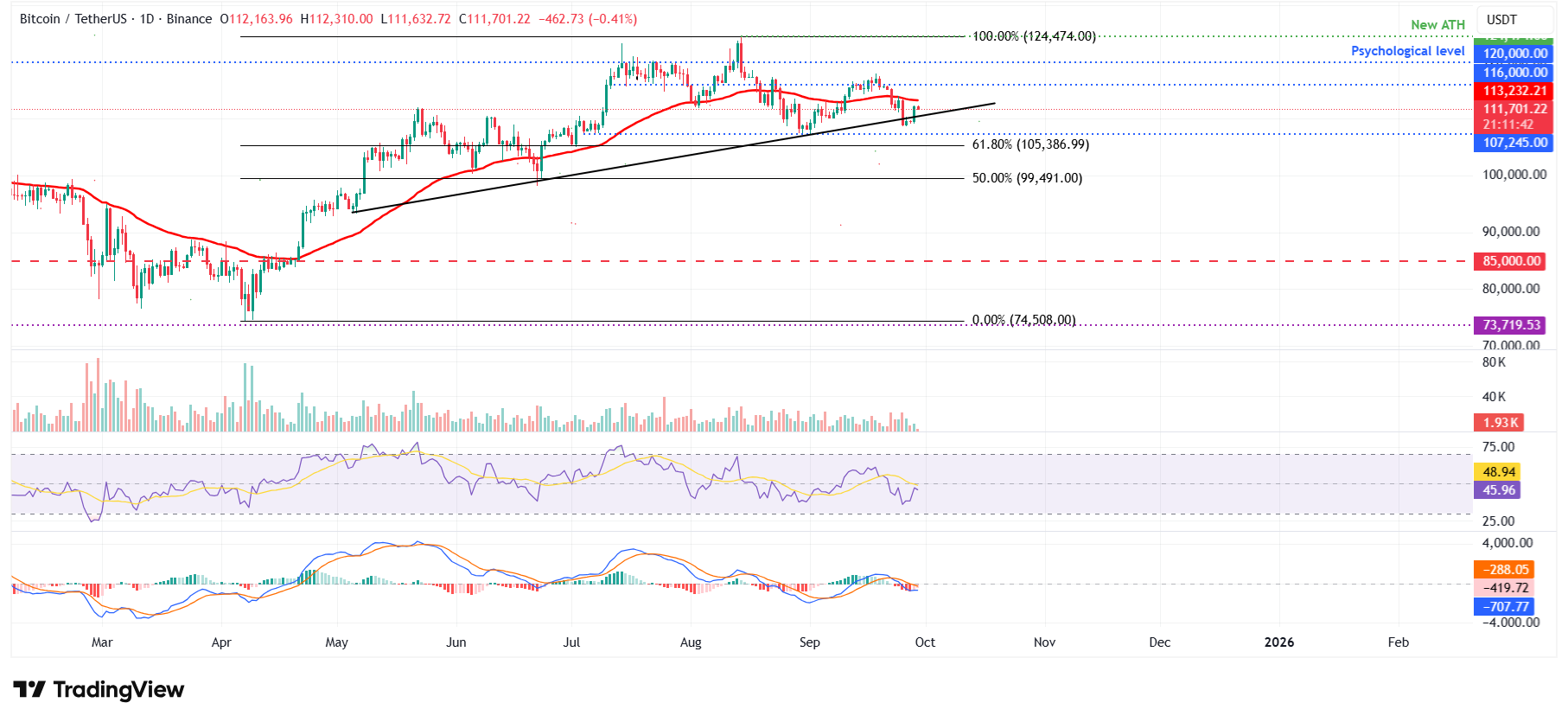 El precio del Bitcoin no logró encontrar soporte alrededor de 116.000 $ el 19 de septiembre y cayó un 6%, alcanzando un mínimo de 108.631 $ el jueves. Sin embargo, BTC se recuperó ligeramente en los siguientes tres días. Al momento de escribir el lunes, cotiza alrededor de 111.700 $.