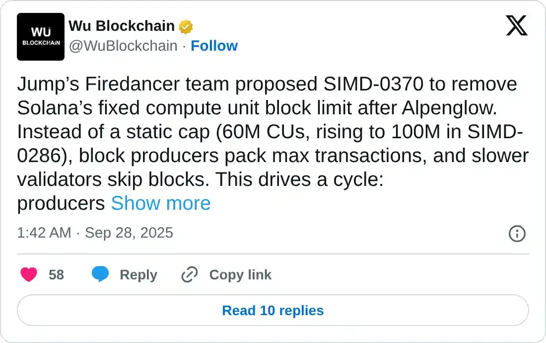 Aparte de los ETFs al contado, las noticias de desarrollo en la blockchain de SOL añaden una perspectiva alcista. Según Wu Blockchain, el equipo Firedancer de Jump ha introducido la propuesta SIMD-0370, que tiene como objetivo eliminar el límite fijo de unidades de computación (CU) por bloque de Solana después de la actualización Alpenglow.