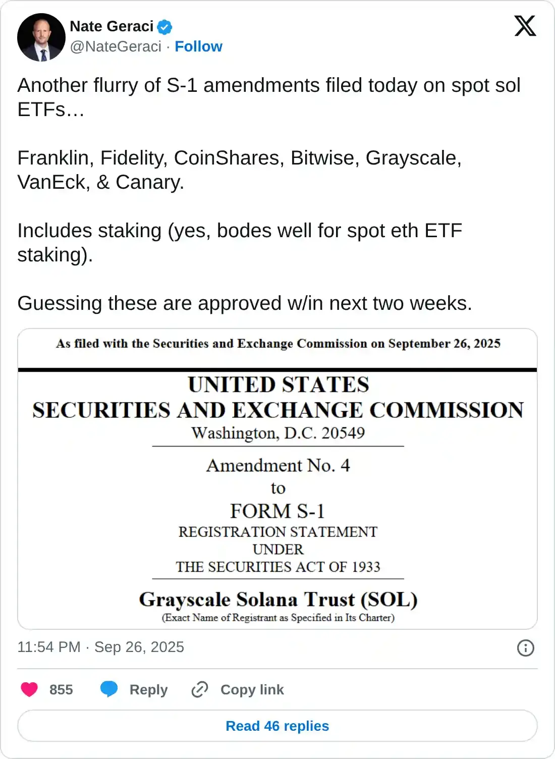 El CEO de ETF Store, Nate Geraci, señaló en su cuenta de X el sábado que los principales actores, incluidos Franklin, Fidelity, CoinShares, Bitwise, Grayscale, VanEck y Canary, han presentado otra ronda de enmiendas S-1 para ETFs de Solana al contado.