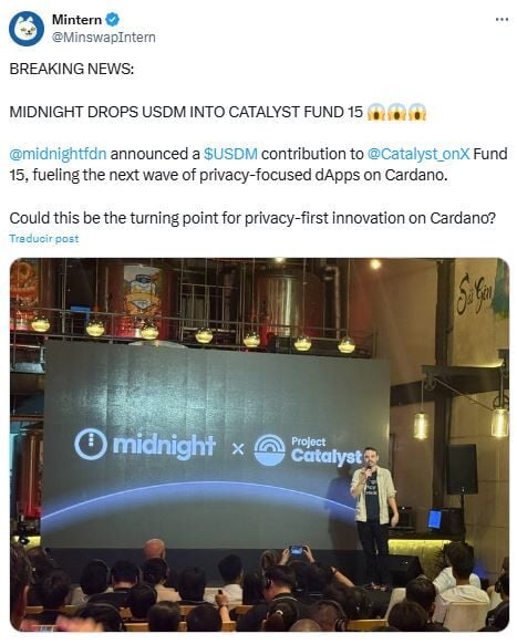 En medio de este mercado lento, el motor de innovación de Cardano sigue funcionando. Según el analista Mintern, la Fundación Midnight donó USDM al Proyecto Catalyst Fund 15, una iniciativa de financiación abierta dentro del ecosistema de Cardano. La donación está dirigida a desarrolladores centrados en aplicaciones que priorizan la privacidad, posiblemente uno de los desafíos más difíciles de la cadena de bloques.
