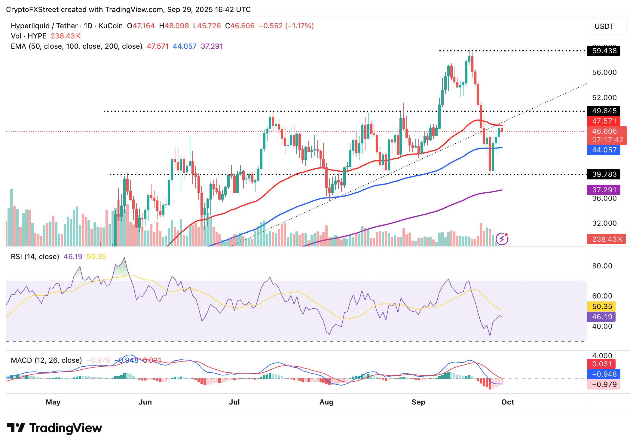 Hyperliquid (HYPE) está navegando en un mercado de criptomonedas altamente volátil, cotizando por encima de los 46$ en el momento de escribir este artículo el lunes. El token nativo del Intercambio Descentralizado (DEX) probó el soporte en 39.78$ el jueves pasado, marcando una corrección del 33% desde su máximo histórico de 59.43$, alcanzado el 18 de septiembre.