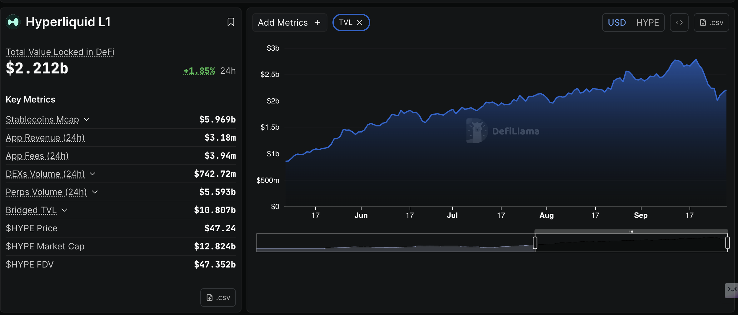 El Valor Total Bloqueado (TVL) en Finanzas Descentralizadas (DeFi) de Hyperliquid se sitúa en 2.21 mil millones de dólares, un aumento del 1.85% en las últimas 24 horas. Después de alcanzar un máximo de 2.78 mil millones de dólares el 19 de septiembre, el nivel de TVL más alto registrado, la incertidumbre en el mercado de criptomonedas más amplio la semana pasada llevó a una caída a 2.01 mil millones de dólares.