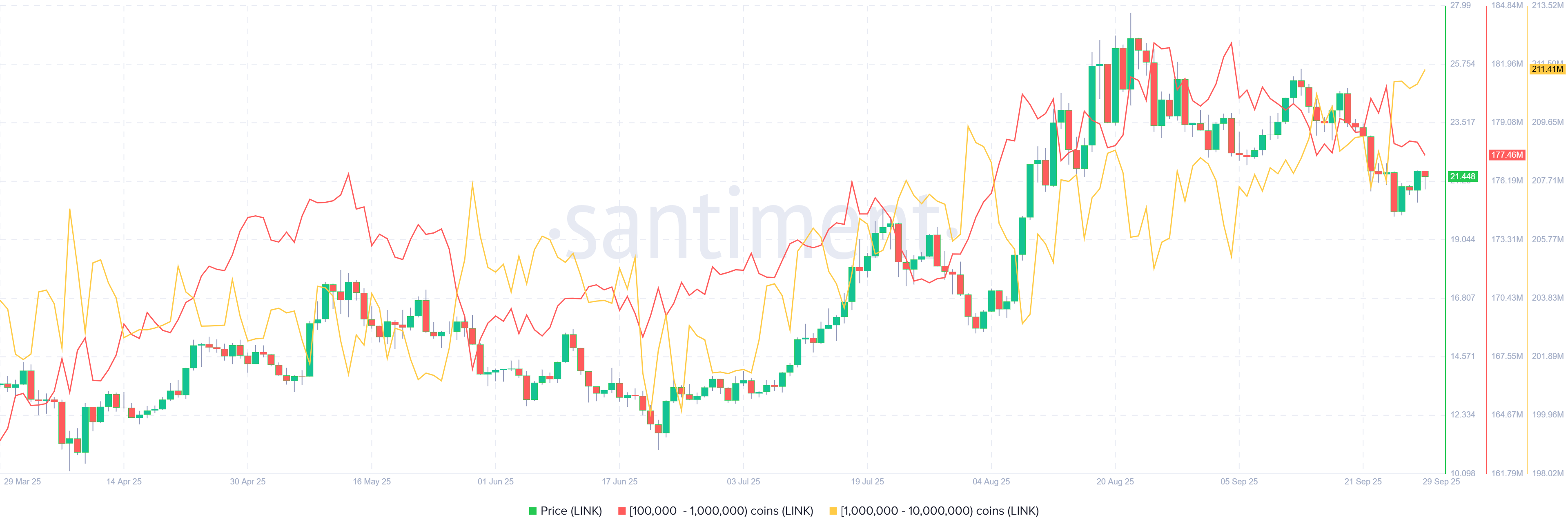 La métrica indica que las ballenas que poseen entre 1 millón y 10 millones de tokens LINK (línea amarilla) han acumulado 3.7 millones de tokens desde el 24 de septiembre hasta el martes. Durante el mismo período, las carteras que poseen entre 100.000 y 1 millón de tokens LINK (línea roja) han reducido 3.38 millones de tokens.