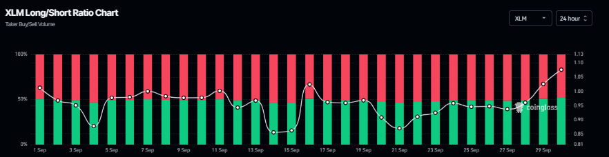 En el lado de los derivados, las apuestas alcistas de XLM entre los operadores alcanzan el nivel más alto en más de un mes. El gráfico de CoinGlass a continuación muestra que la relación larga-corta de XLM se sitúa en 1.07 el martes, lo que indica que los operadores están apostando a que el precio del activo suba.